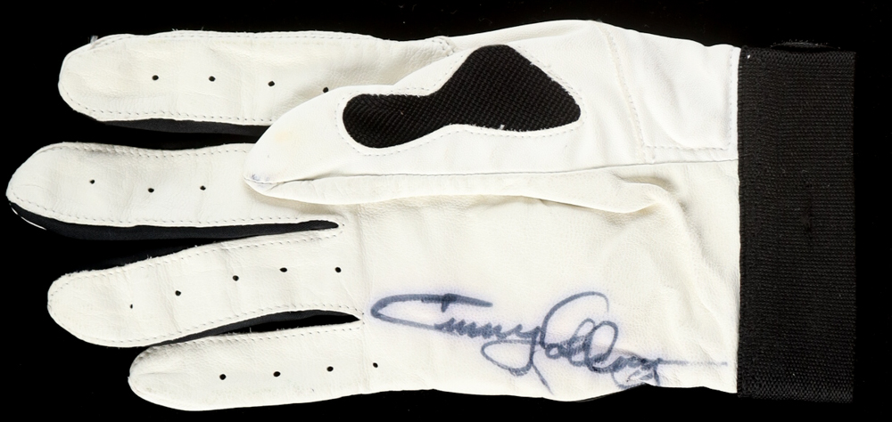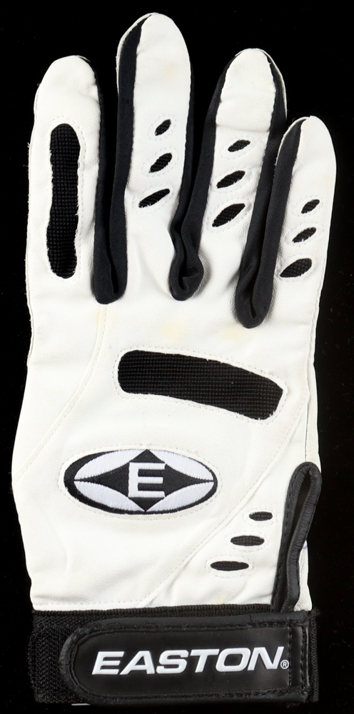 Easton Right Batting Glove has been hand-signed by Jimmy Rollins (Philadelphia Phillies). Please note, the signature has bled and there are stains throughout the glove.