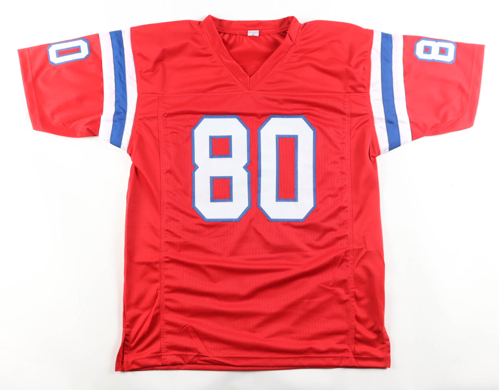 Custom jersey with everything sewn on, size XL. Hand-signed and inscribed by Irving Fryar. Please note, there is red staining on the reverse number.