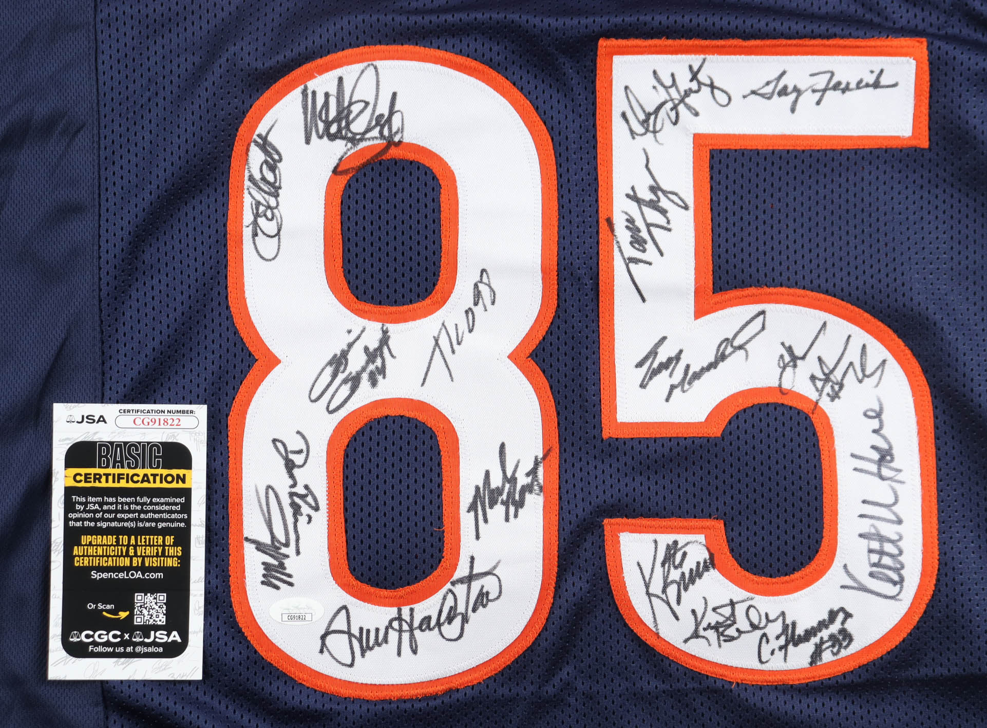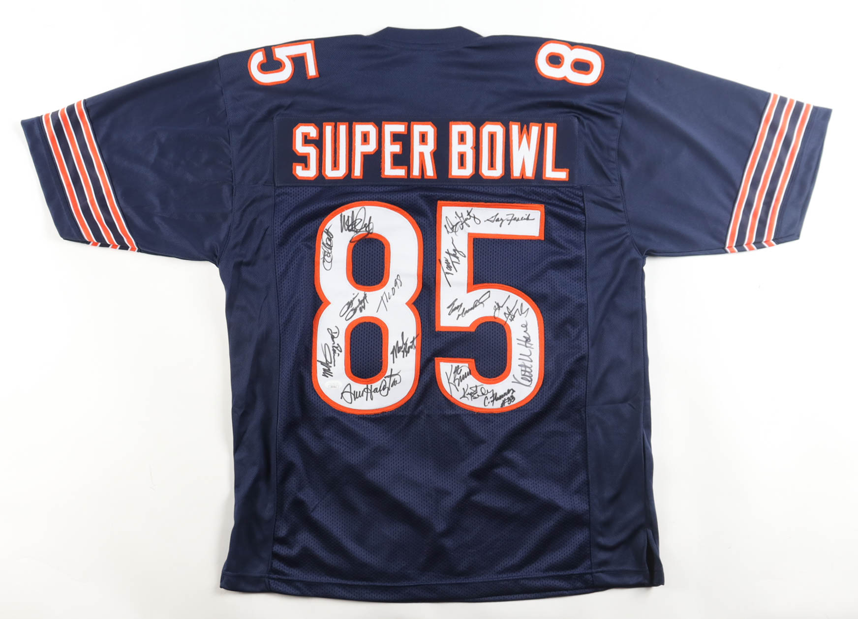 Custom jersey with everything sewn on, size XL. Hand-signed by (12) with Mike Singletary (HOF), Dan Hampton (HOF), Tom Thayer, Mark Bortz, Emery Moorehead, Dan Rains, Matt Suhey, Gary Fencik, Tyrone Keys, Dennis Gentry, Calvin Thomas, Stefan Humphries, Keith Van Horne, Kurt Becker, Kevin Butler, Willie Gault, & Brian Baschangel