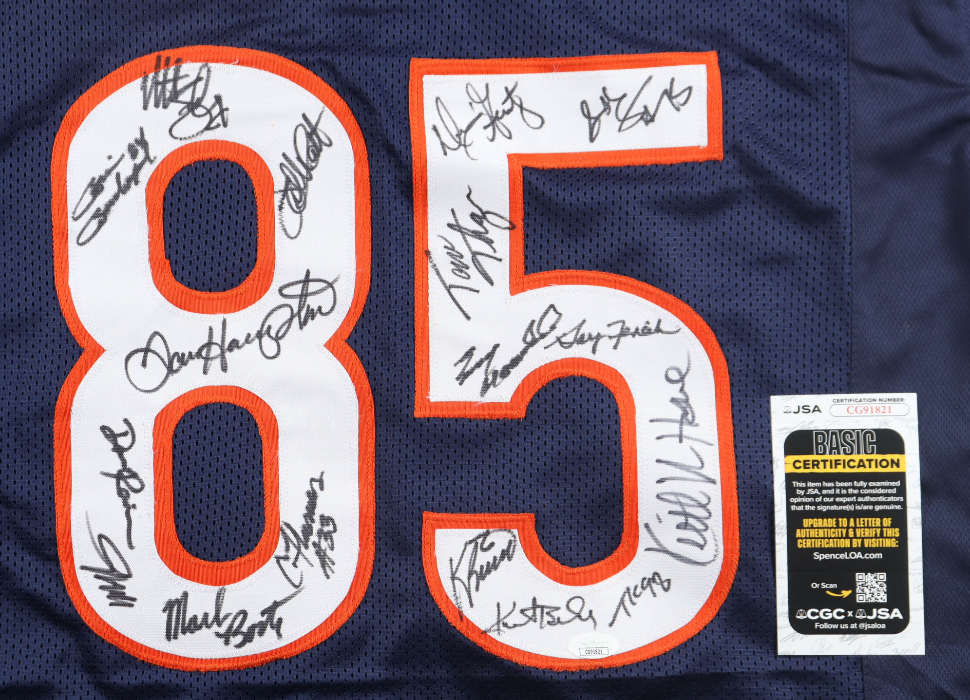 Custom jersey with everything sewn on, size XL. Hand-signed by (12) with Mike Singletary (HOF), Dan Hampton (HOF), Tom Thayer, Mark Bortz, Emery Moorehead, Dan Rains, Matt Suhey, Gary Fencik, Tyrone Keys, Dennis Gentry, Calvin Thomas, Stefan Humphries, Keith Van Horne, Kurt Becker, Kevin Butler, Willie Gault, & Brian Baschangel.