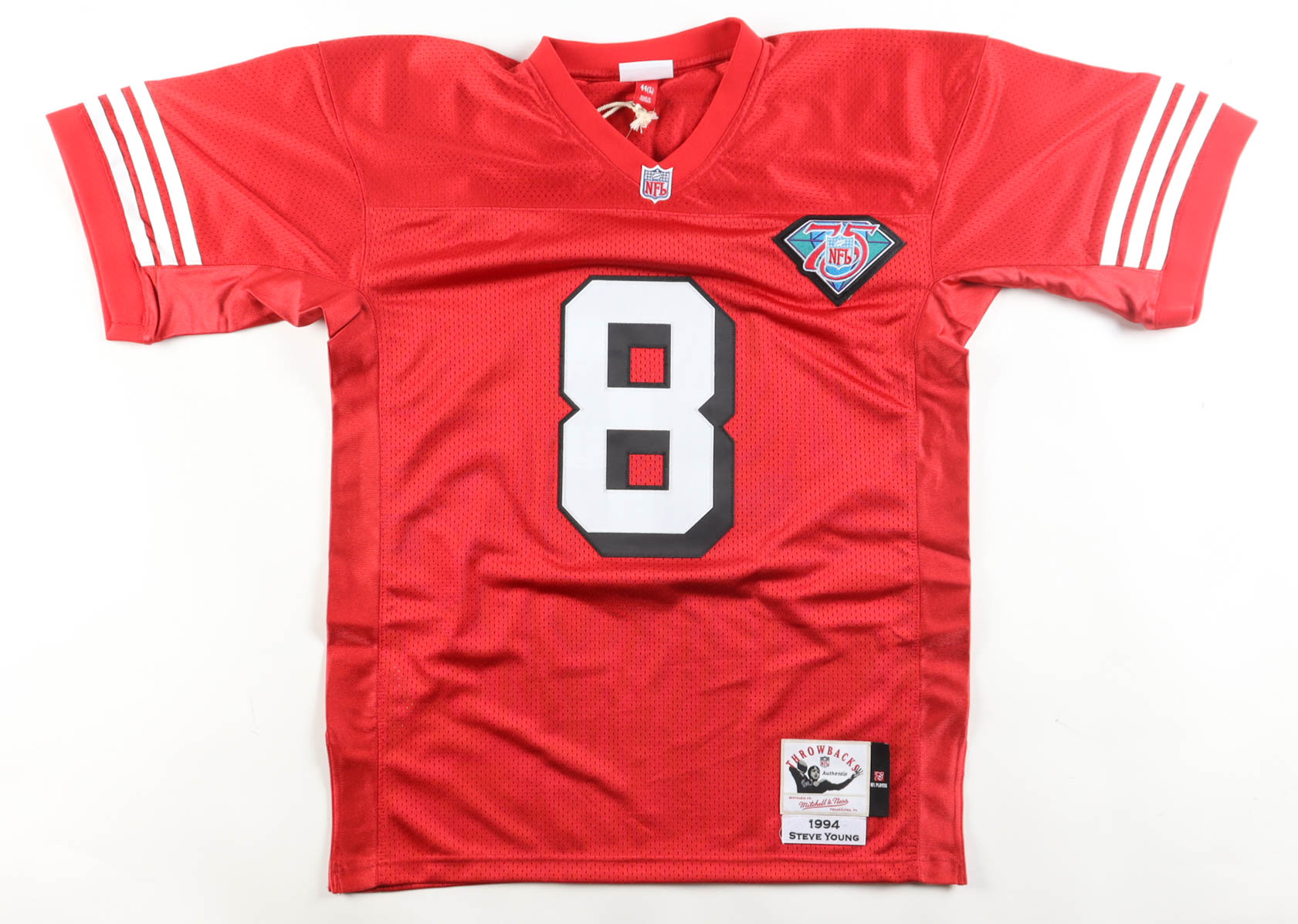 Mitchell & Ness authentic jersey with everything sewn on, size L. Hand-signed by Steve Young (San Francisco 49ers).