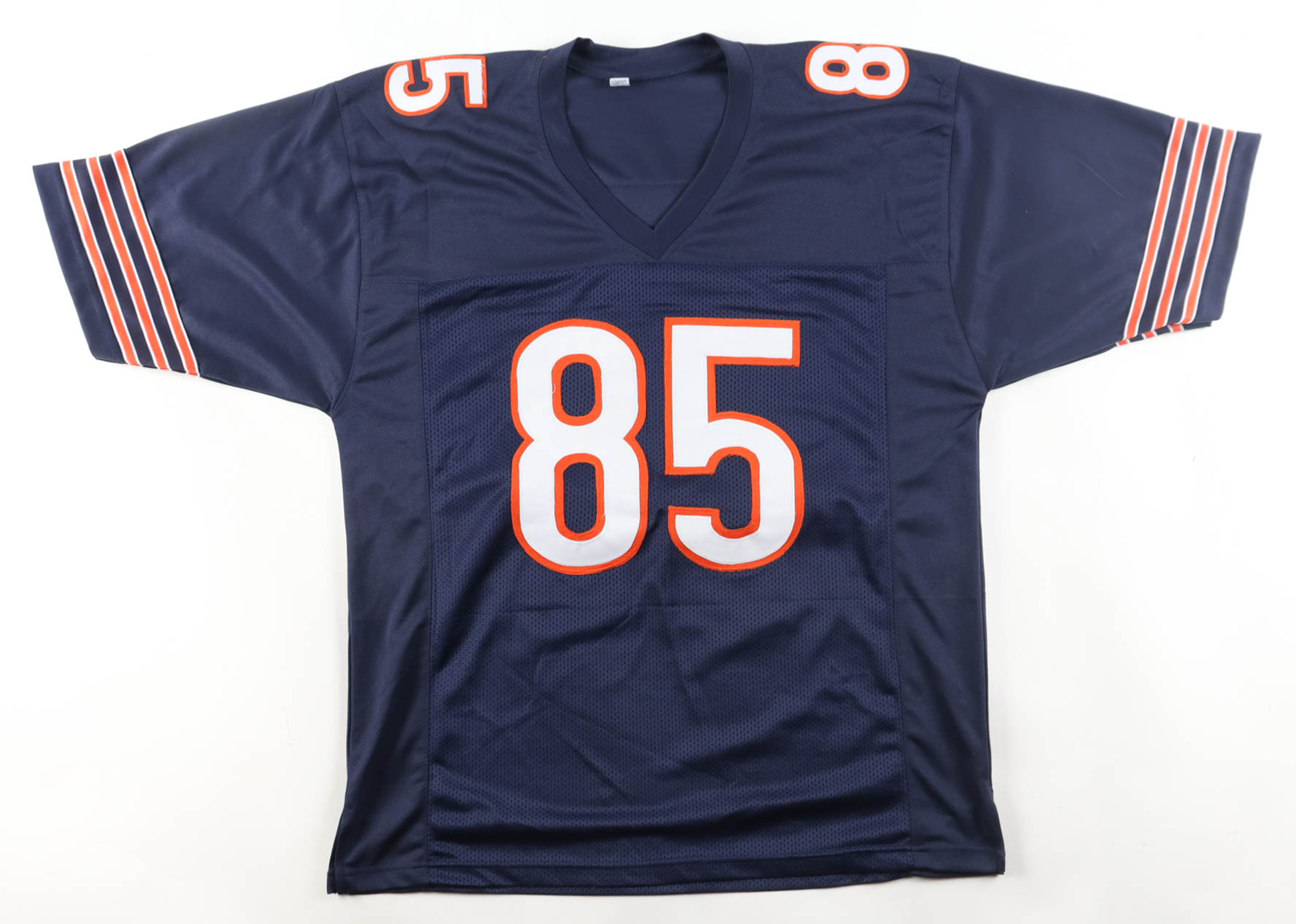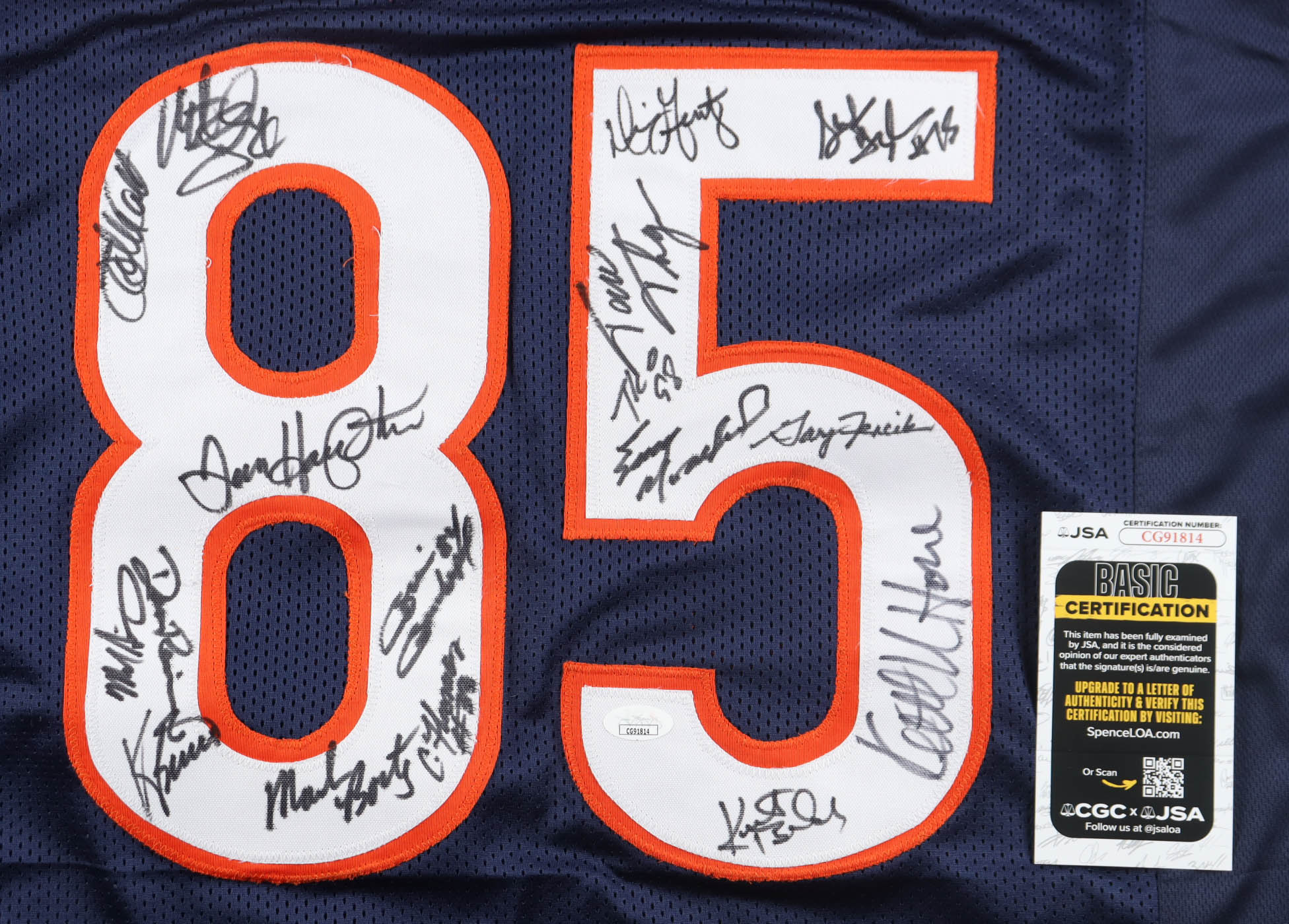 Custom jersey with everything sewn on, size XL. Hand-signed by (12) with Mike Singletary (HOF), Dan Hampton (HOF), Tom Thayer, Mark Bortz, Emery Moorehead, Dan Rains, Matt Suhey, Gary Fencik, Tyrone Keys, Dennis Gentry, Calvin Thomas, Stefan Humphries, Keith Van Horne, Kurt Becker, Kevin Butler, Willie Gault, & Brian Baschangel.