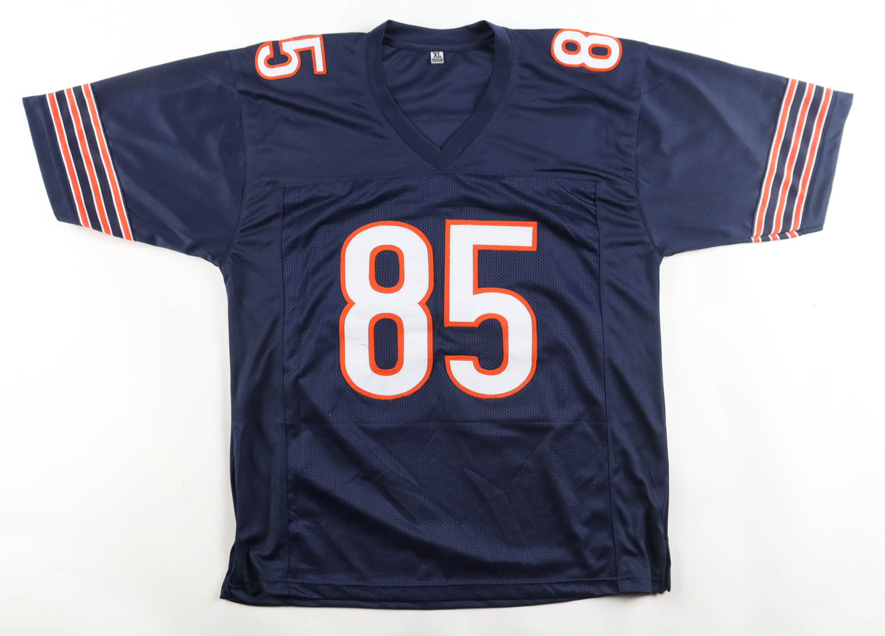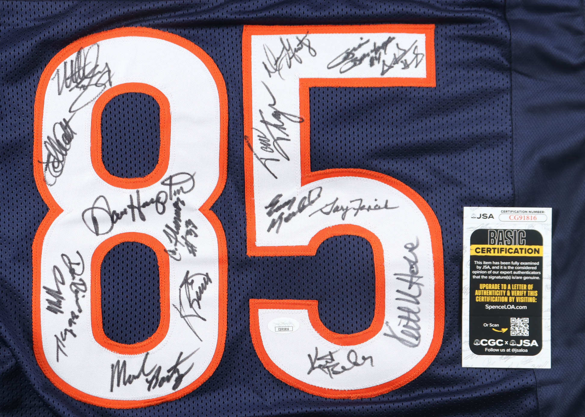 Custom jersey with everything sewn on, size XL. Hand-signed by (12) with Mike Singletary (HOF), Dan Hampton (HOF), Tom Thayer, Mark Bortz, Emery Moorehead, Dan Rains, Matt Suhey, Gary Fencik, Tyrone Keys, Dennis Gentry, Calvin Thomas, Stefan Humphries, Keith Van Horne, Kurt Becker, Kevin Butler, Willie Gault, & Brian Baschangel.