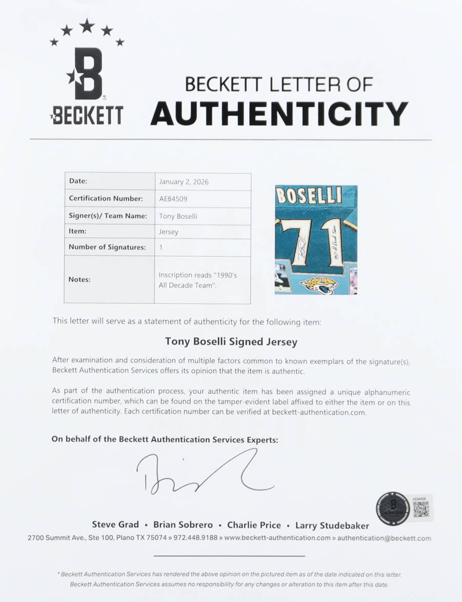 Custom frame measures 35" x 38" in size and features a jersey that has been hand-signed and inscribed by Tony Boselli.