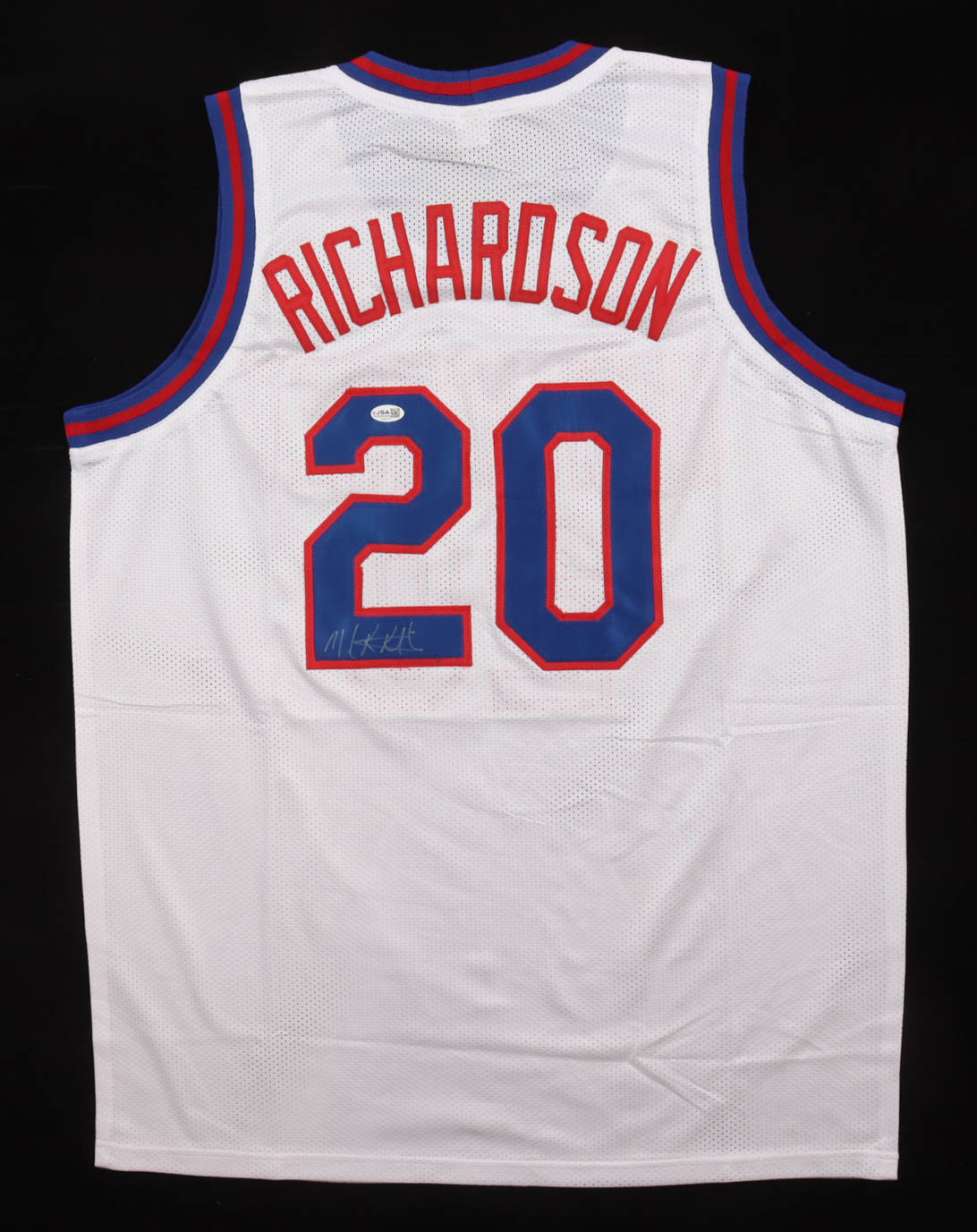 Custom jersey, everything is sewn on, size XL. Hand-signed by Micheal Ray Richardson (D. 2025).