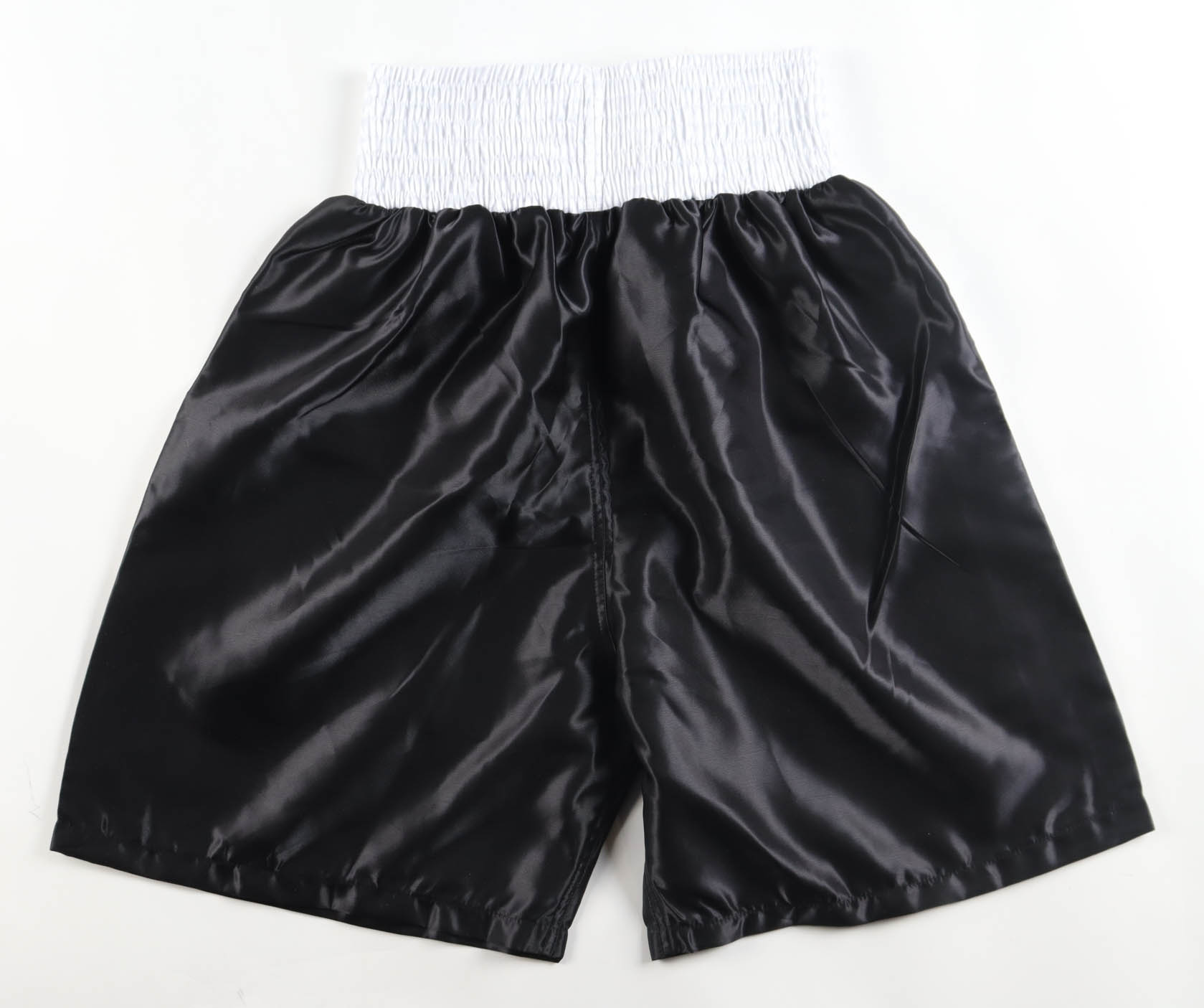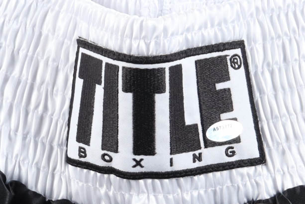 Title boxing shorts have been hand-signed and inscribed by Junior Jones.
