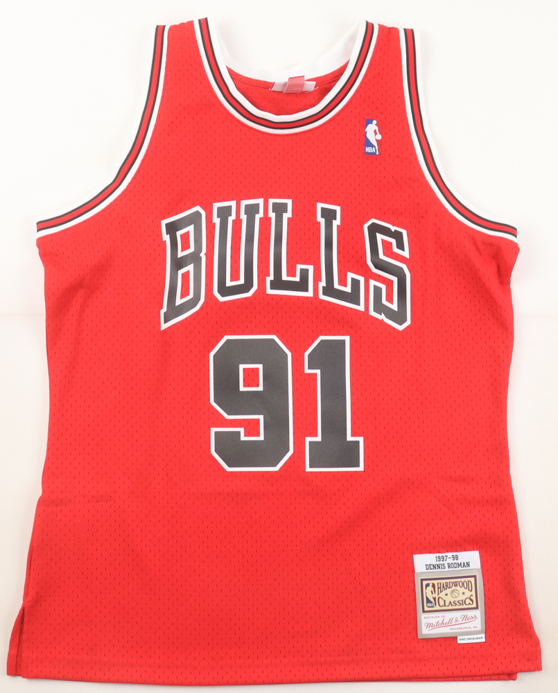 Mitchell & Ness authentic jersey with everything sewn & pressed on, size L. Hand-signed by Dennis Rodman (Chicago Bulls, HOF).
