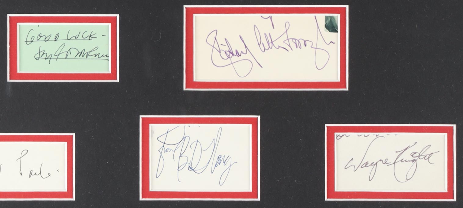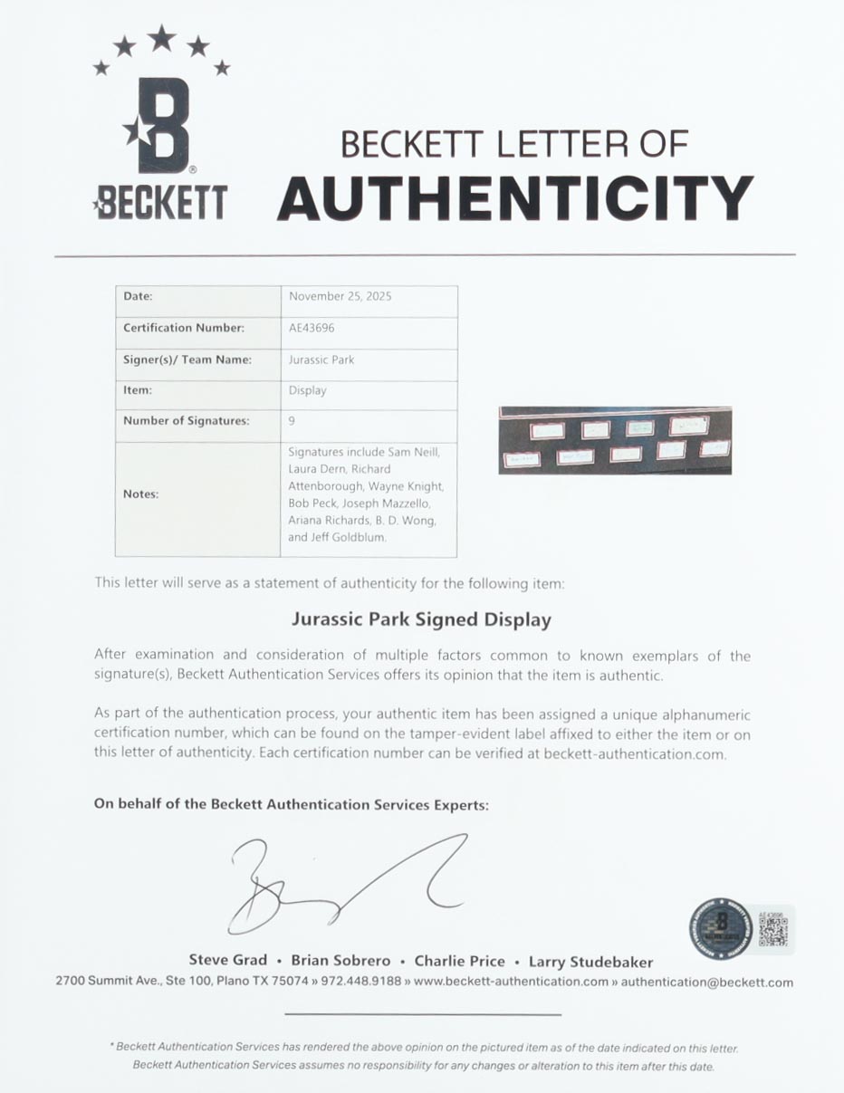 Custom frame measures approximately 34" x 44" in size. The display features a Jurassic Park Movie Poster with cuts that have been hand-signed by (9) with Sam Neill, Laura Dern, Richard Attenborough, Wayne Knight, Bob Peck, Joseph Mazzello, Ariana Richards, B.D. Wong and Jeff Goldblum. Please note, the display is unsigned.