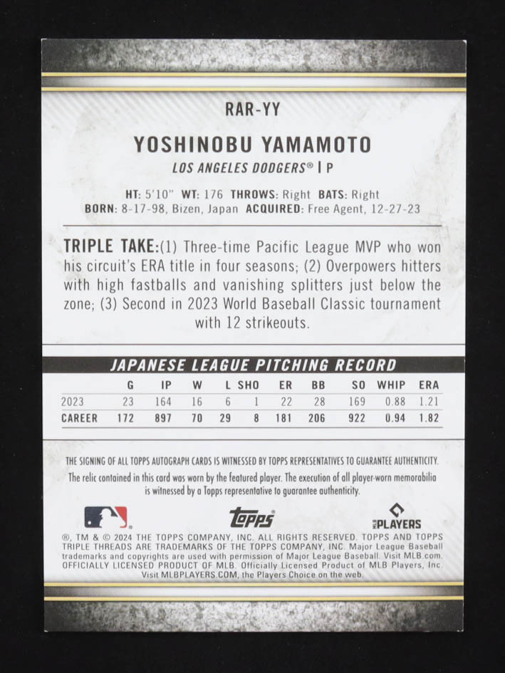 Yoshinobu Yamamoto 2024 Topps Triple Threads Autograph Relics Emerald #RAR-YY RC #19/50