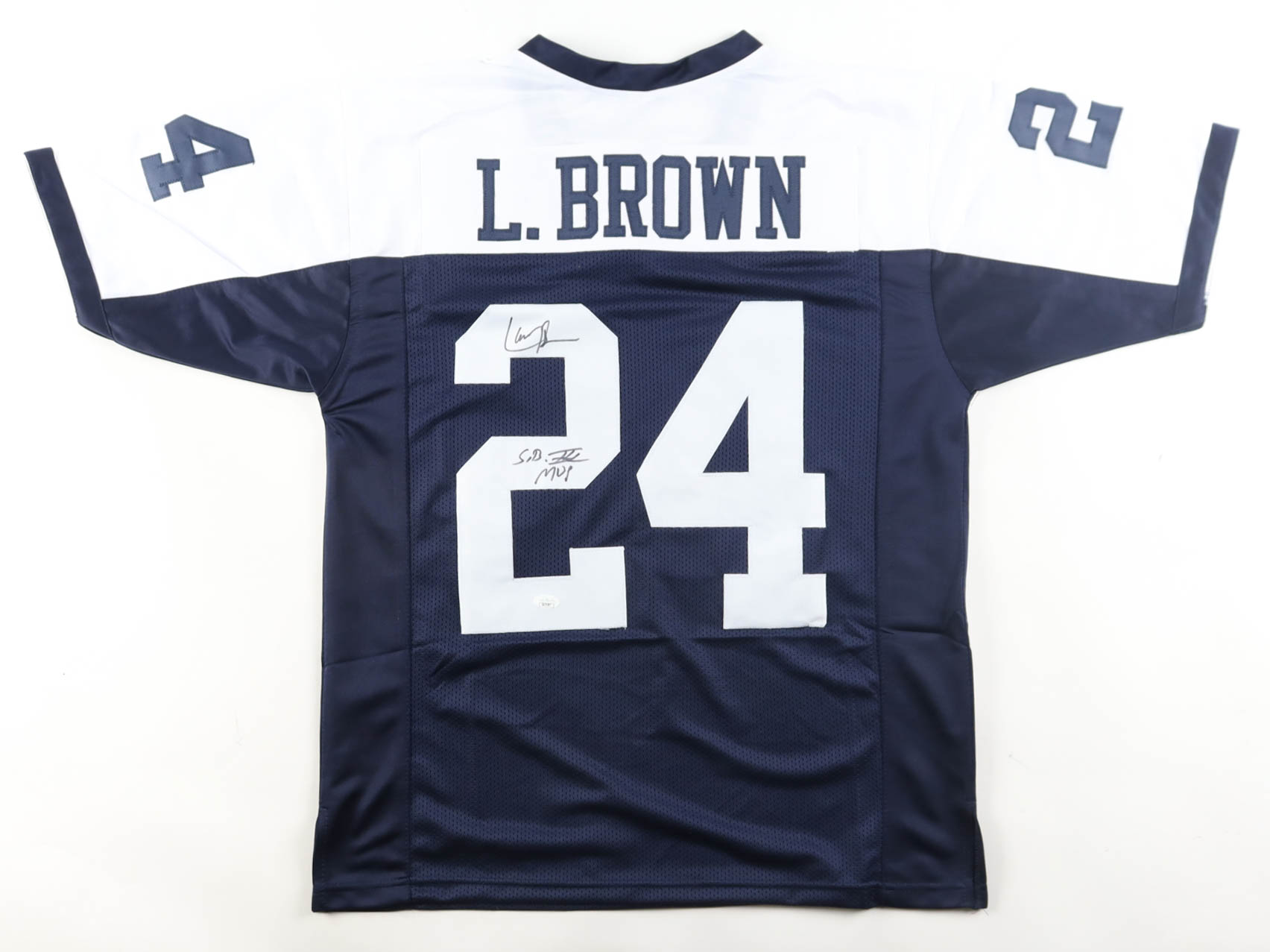 Custom jersey with everything sewn on, size XL. Hand-signed and inscribed by Larry Brown. Please note, glue is visible through the reverse number.