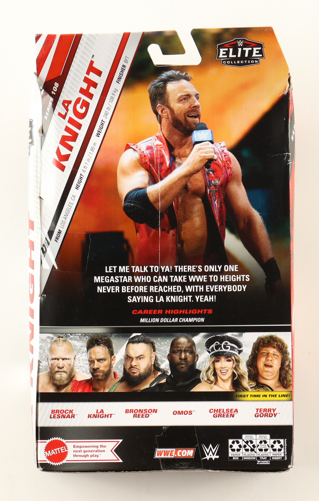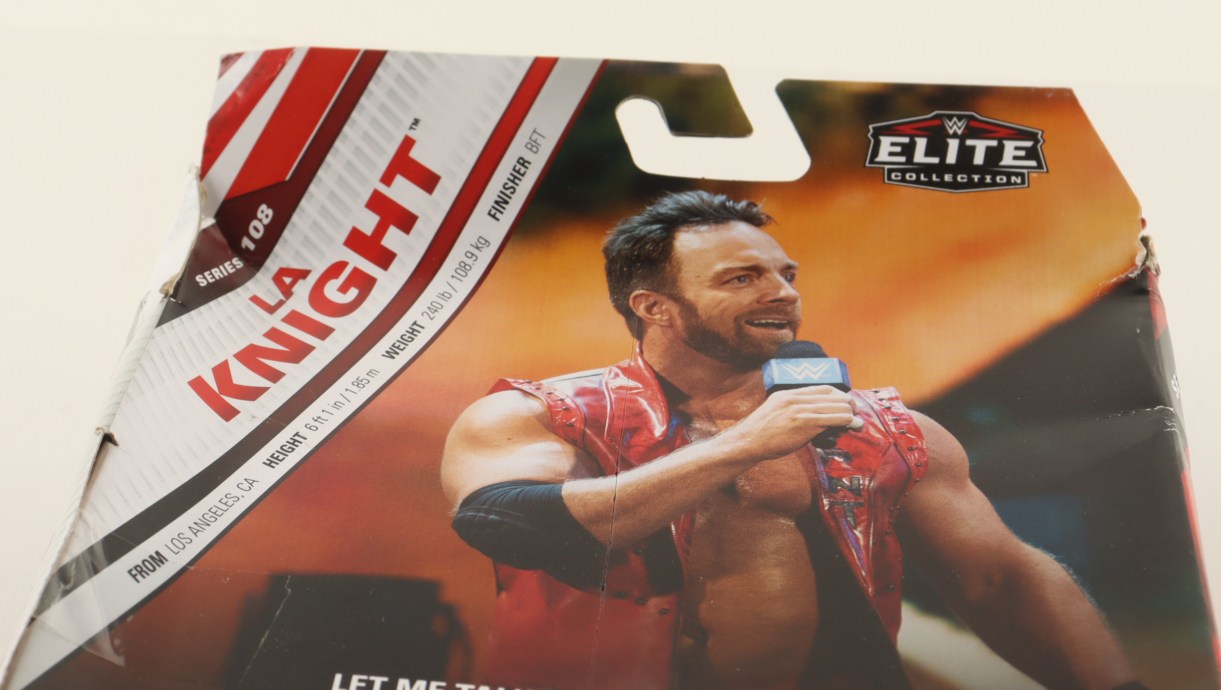 2023 Mattel WWE Series #108 action figure measures approximately 6" tall and has been hand-signed on the packaging by LA Knight. Please note, there is crushing and tearing on the packaging - see photos for more detail regarding the condition of the item.