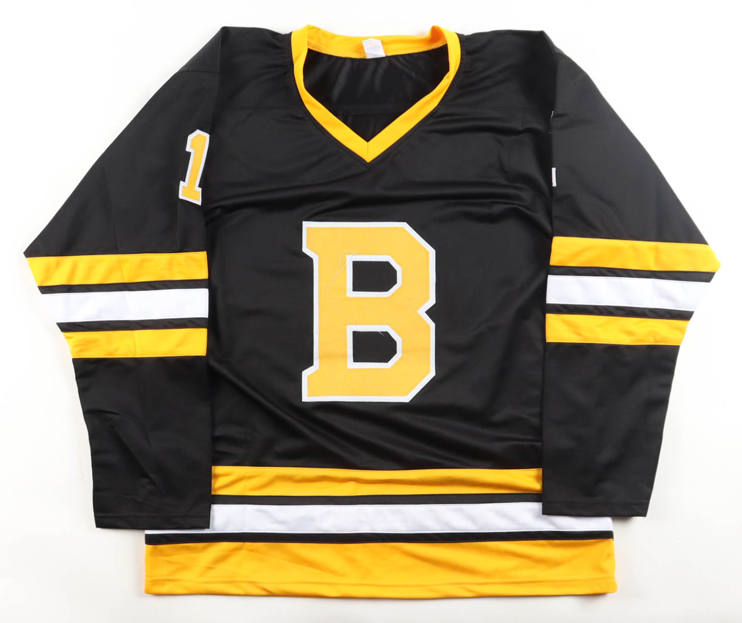 Custom jersey with everything sewn on, size XL. Hand-signed and inscribed by Reggie Lemelin. Please note, the inscriptions have bled.