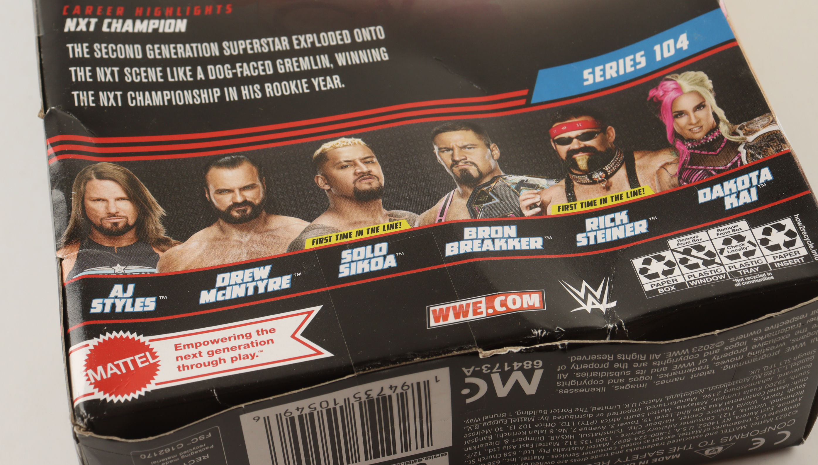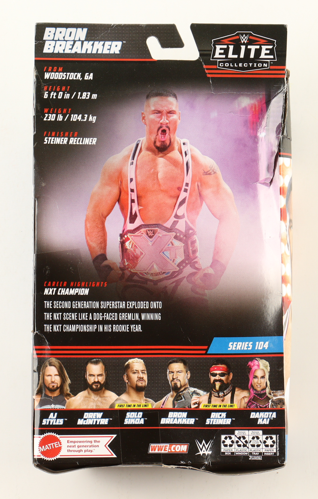 2023 Mattel WWE action figure measures approximately 6" tall and has been hand-signed on the packaging by Bron Breakker. Please note, there is crushing and tearing on the packaging - see photos for more detail regarding the condition of the item.