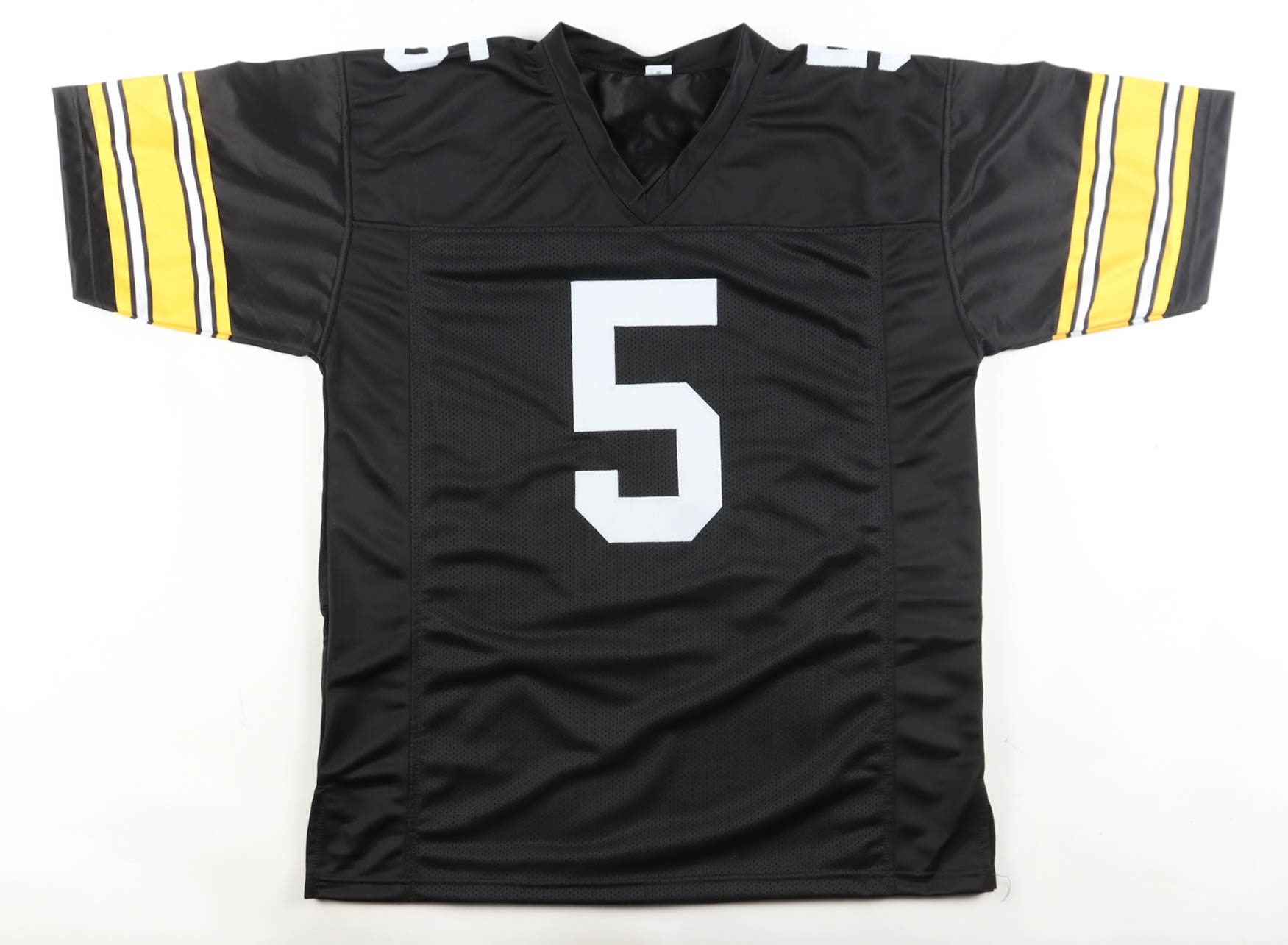 Custom jersey with everything sewn on, size XL. Hand-signed and inscribed by Terry Hanratty. Please note, glue is visible through the reverse number.