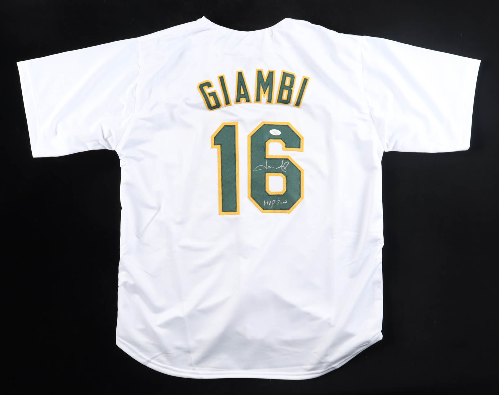 Custom jersey with everything sewn on, size XL. Hand-signed and inscribed by Jason Giambi.
