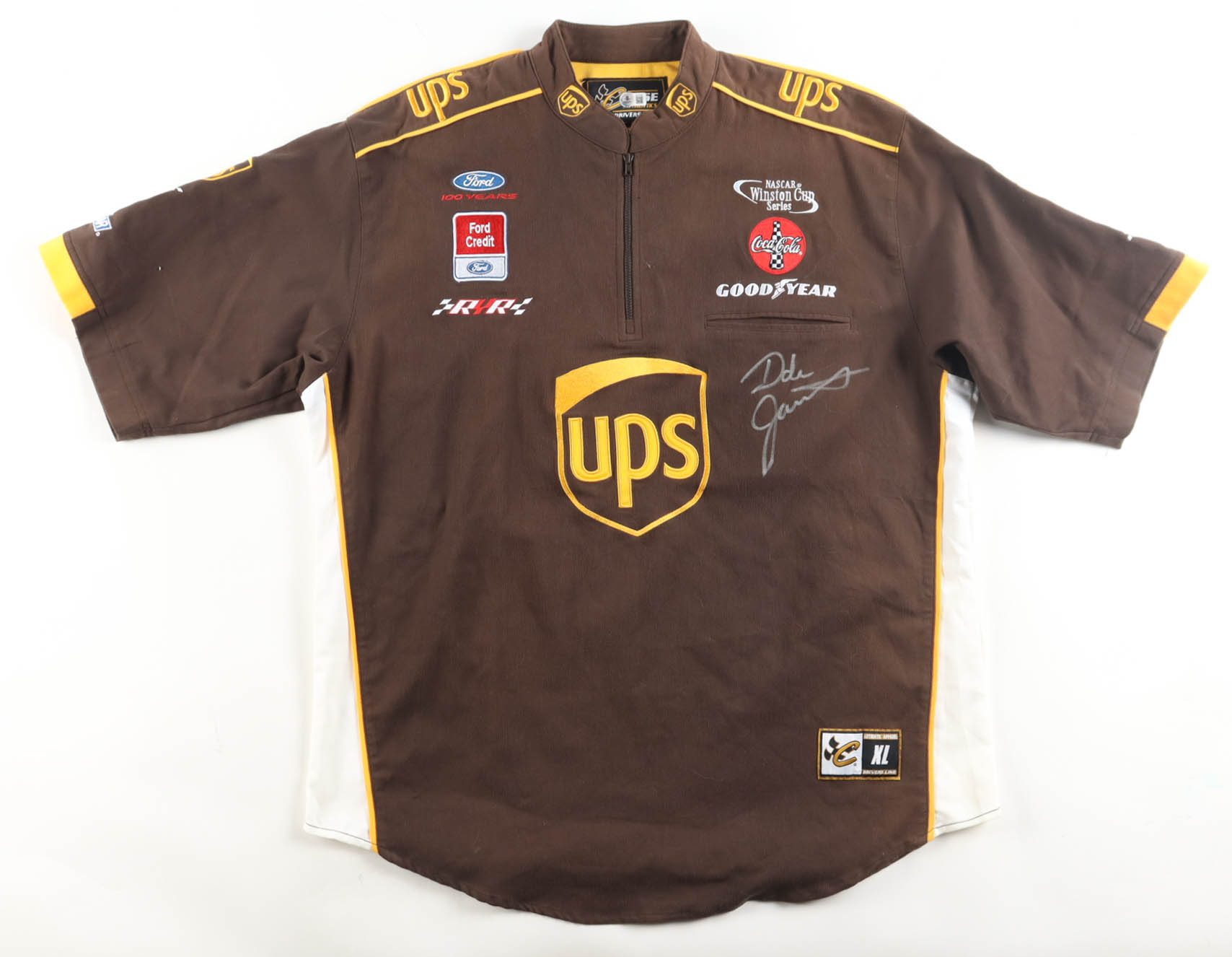 Chase authentic UPS NASCAR racing shirt with everything sewn on, size XL. Hand-signed by Dale Jarrett.