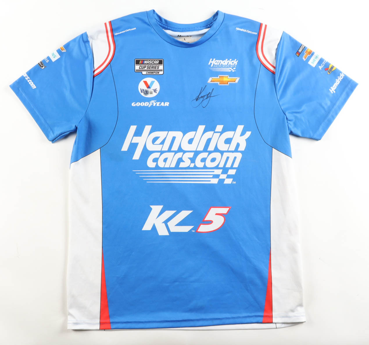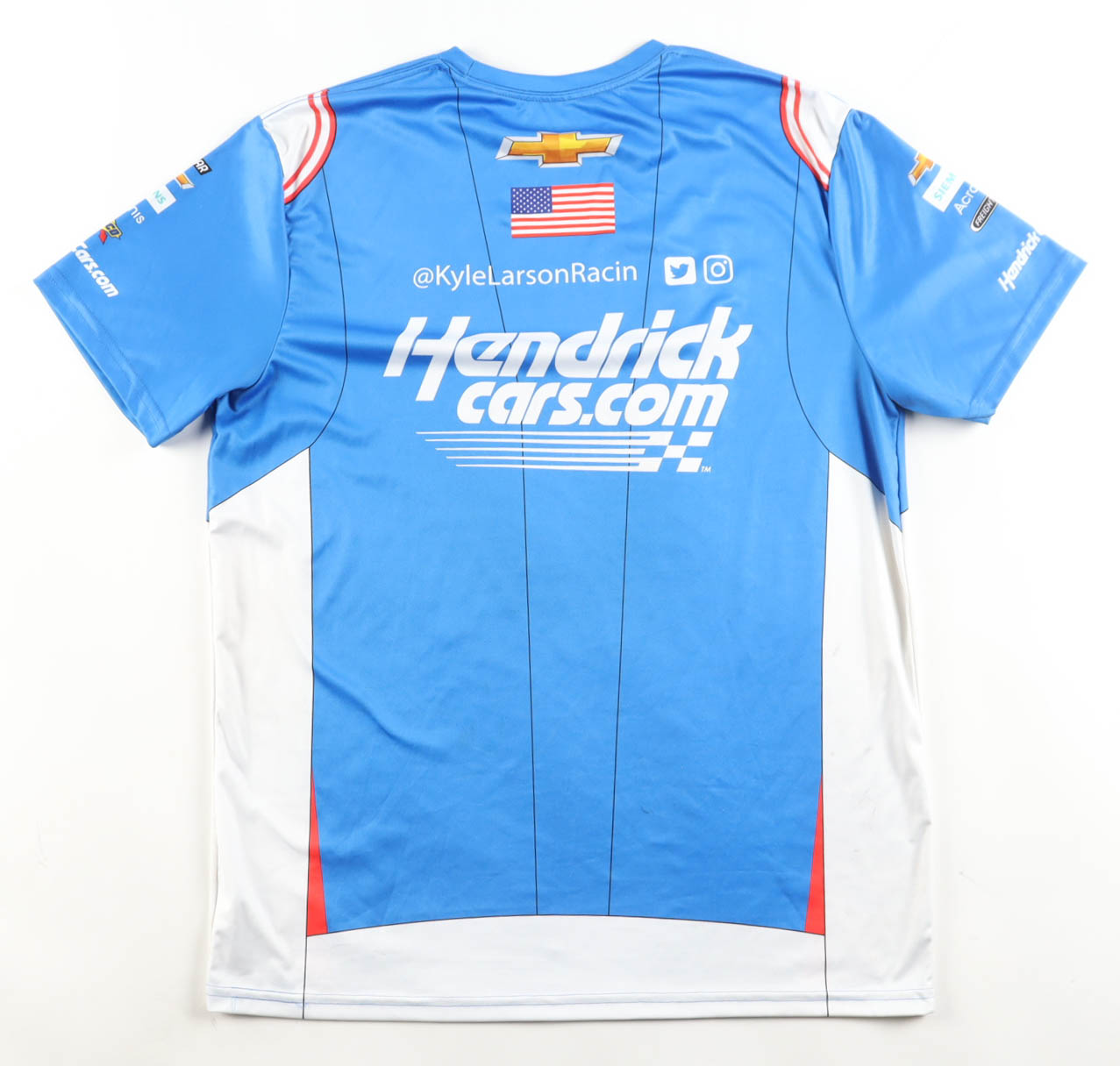 Hendrick Motorsports authentic Valvoline NASCAR racing shirt with everything pressed on, size L. Hand-signed by Kyle Larson.