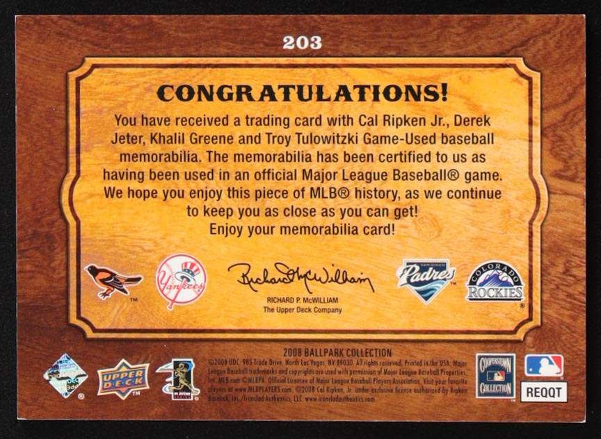 Cal Ripken Jr. / Derek Jeter / Khalil Greene / Troy Tulowitzki 2008 Upper Deck Ballpark Collection #203