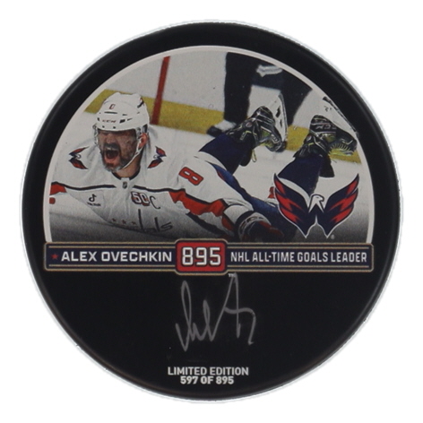 Washington Capitals "Goal 895" logo hockey puck has been hand-signed by Alexander Ovechkin.