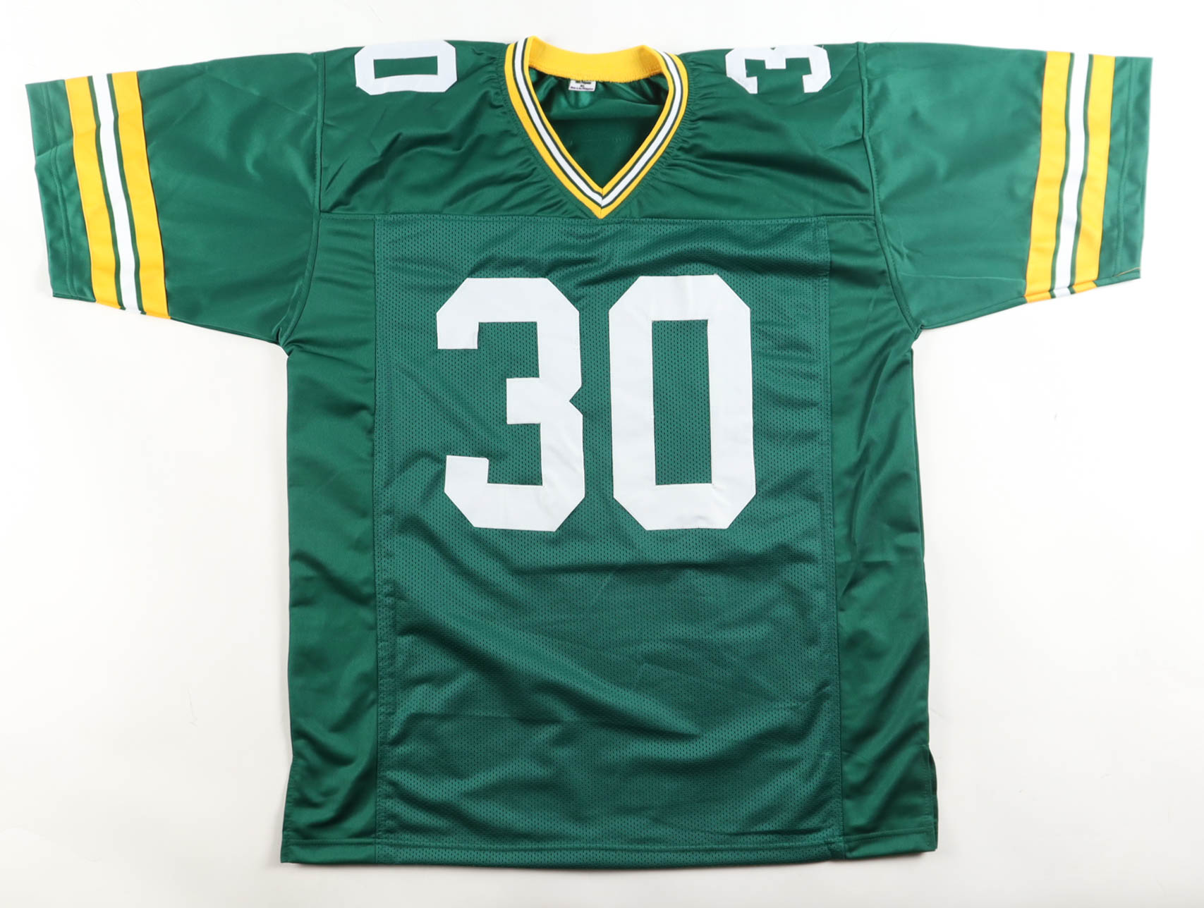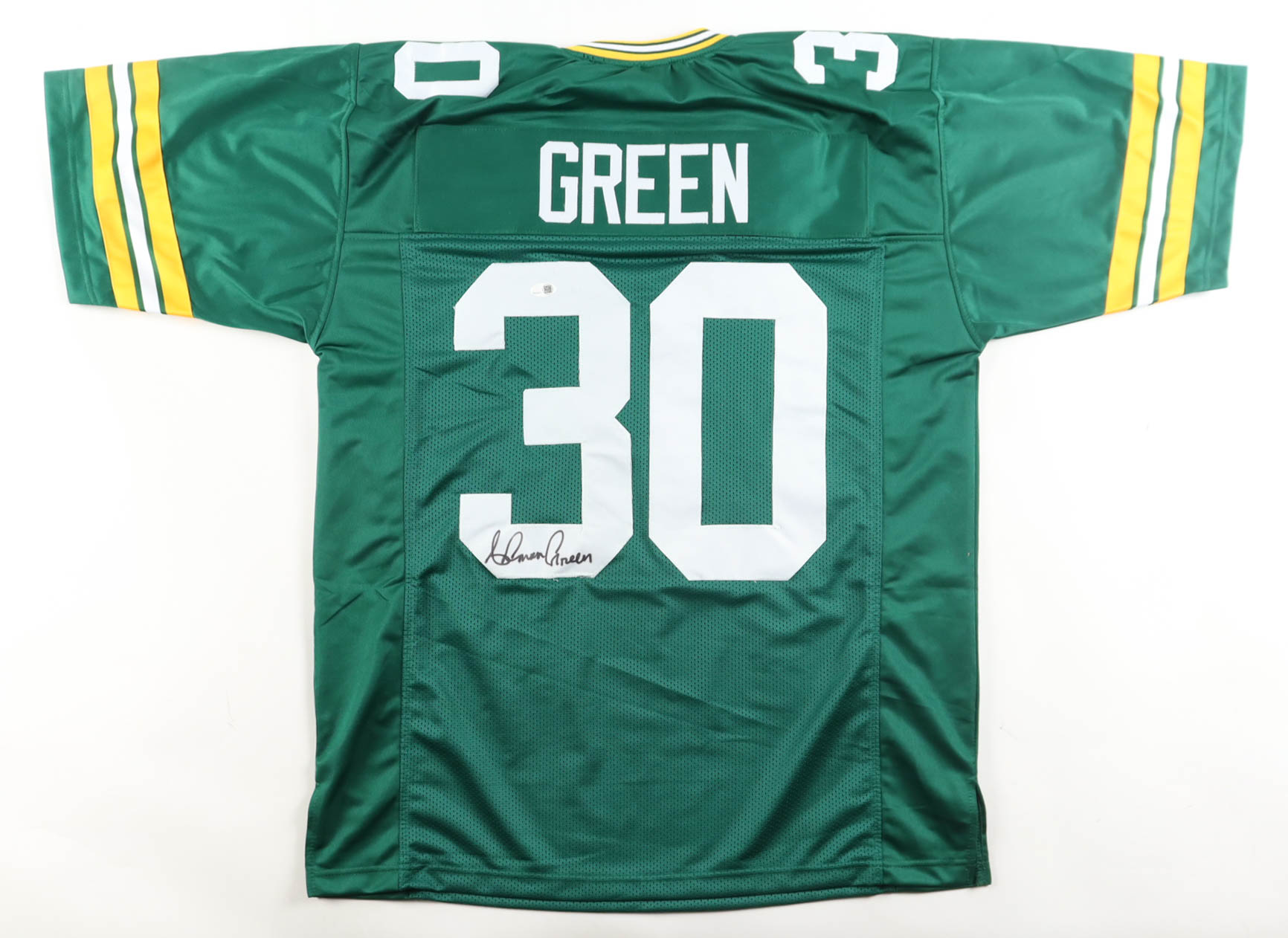 Custom jersey with everything sewn on, size XL. Hand-signed by Ahman Green. Please note, the signature has bled.
