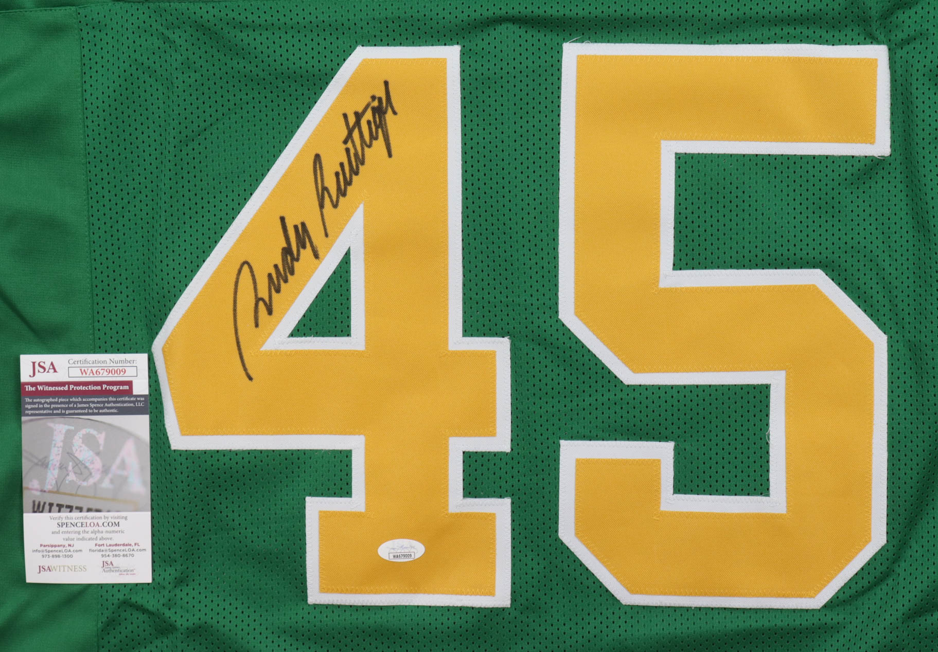 Custom jersey with everything sewn on, size XL. Hand-signed by Rudy Ruettiger (Notre Dame Fighting Irish).