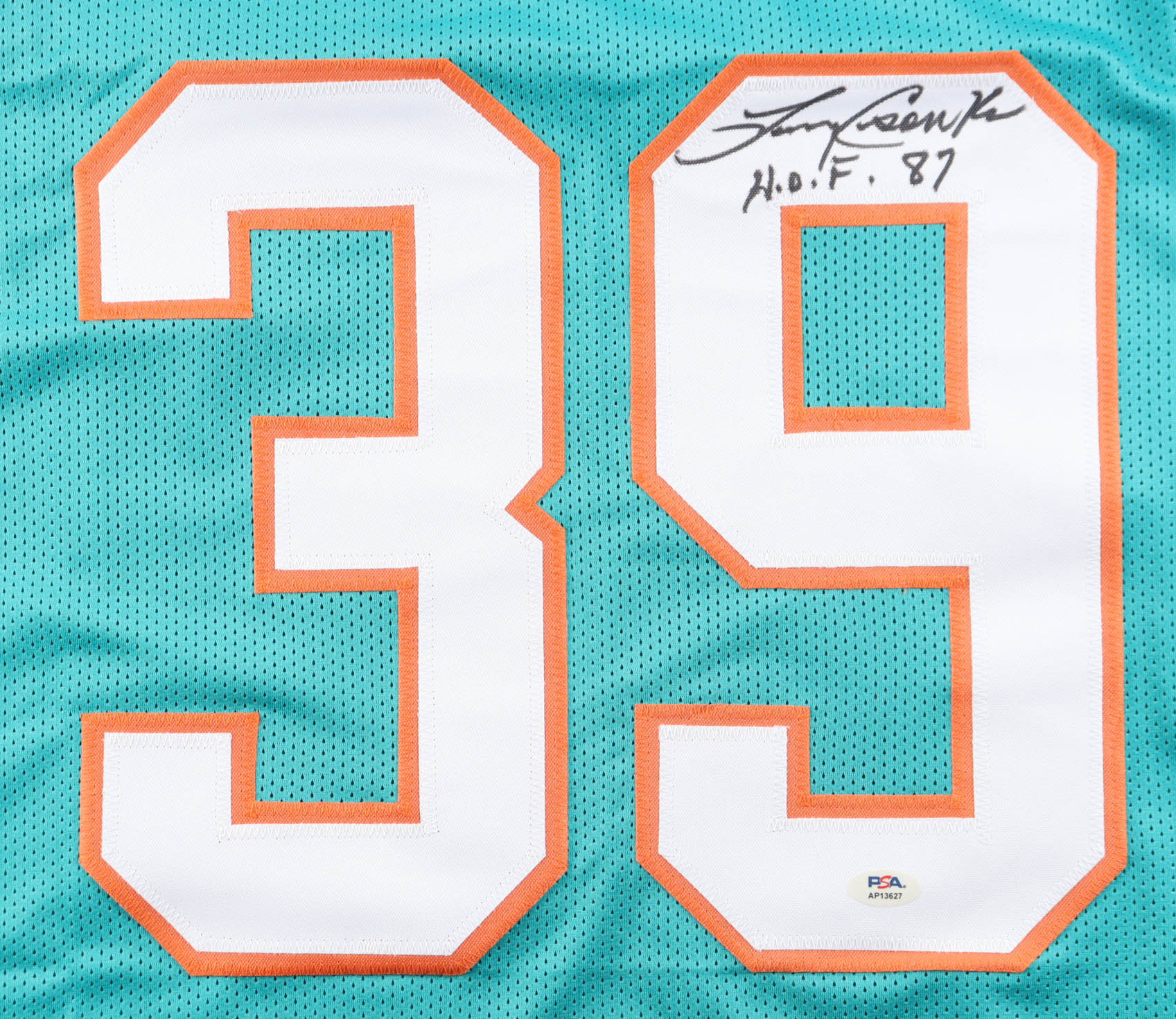 Custom jersey with everything sewn on, size L. Hand-signed and inscribed by Larry Csonka (HOF).