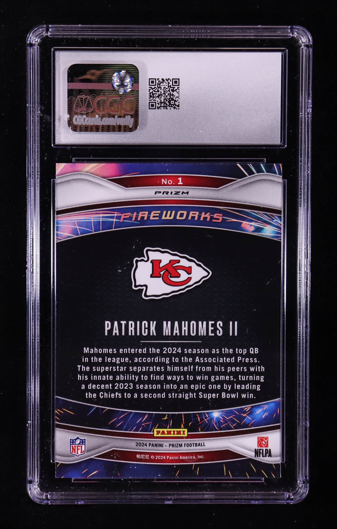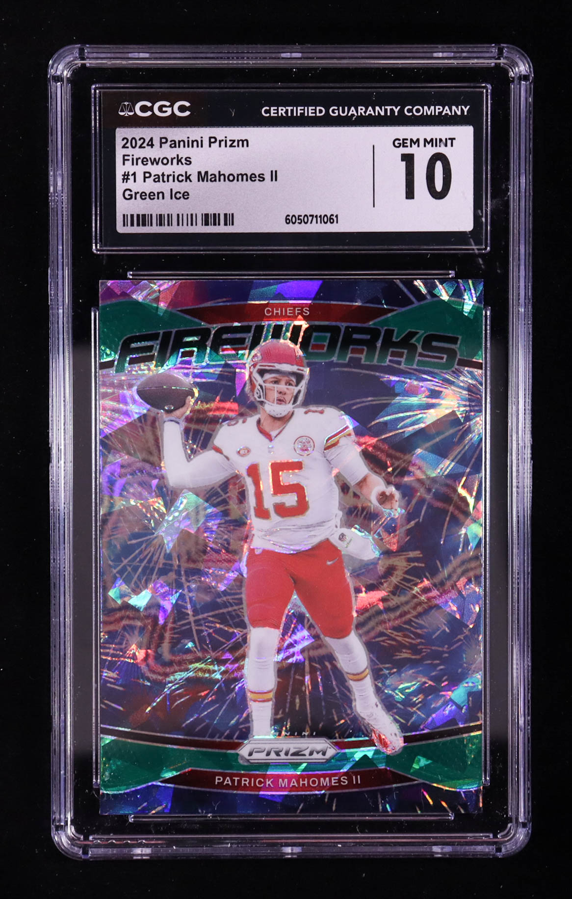 Patrick Mahomes II 2024 Panini Prizm Fireworks Prizms Green Ice #1 (CGC 10)