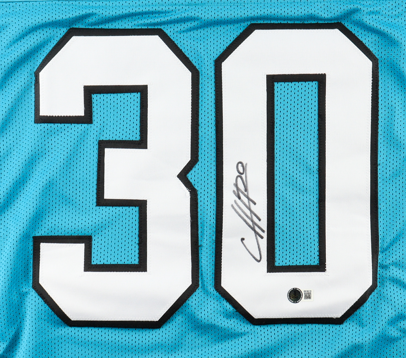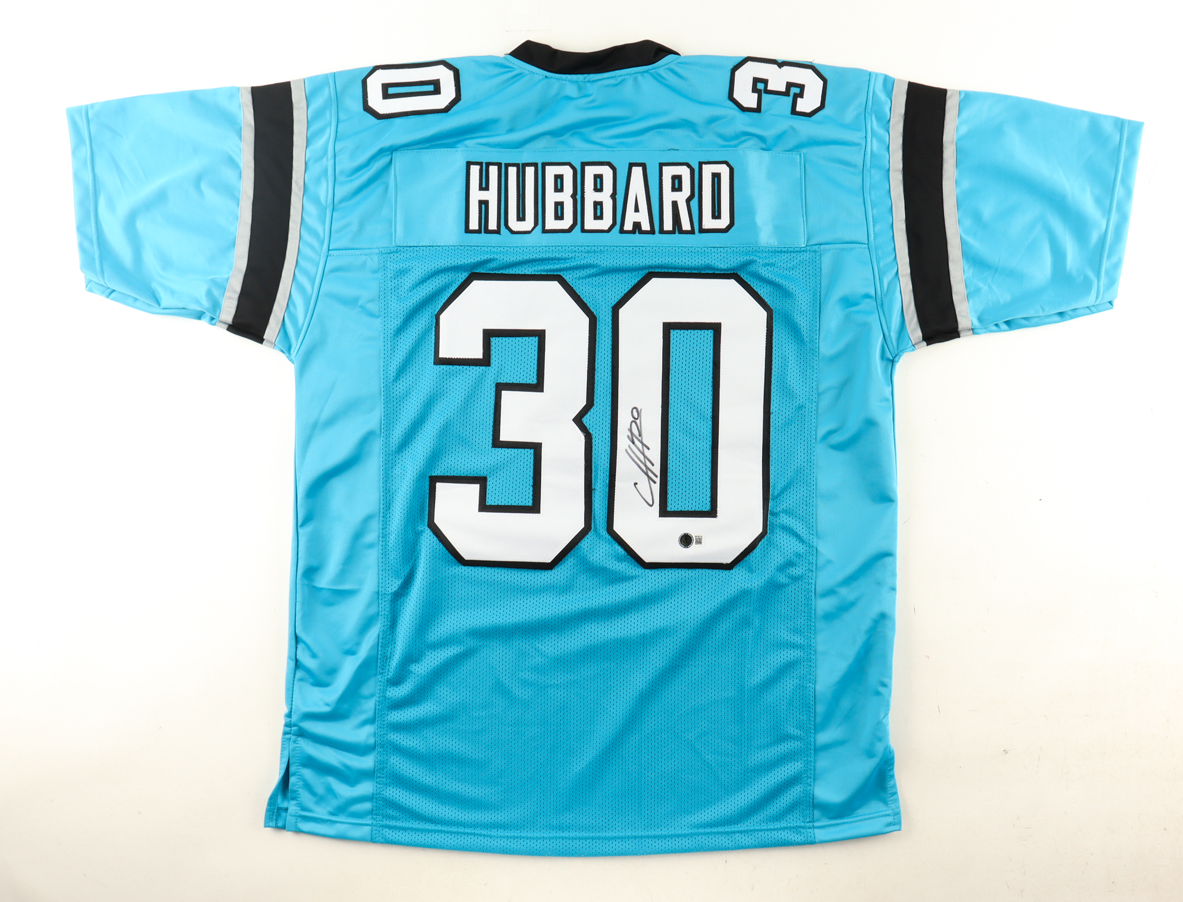 Custom jersey with everything sewn on, size XL. Hand-signed by Chuba Hubbard.