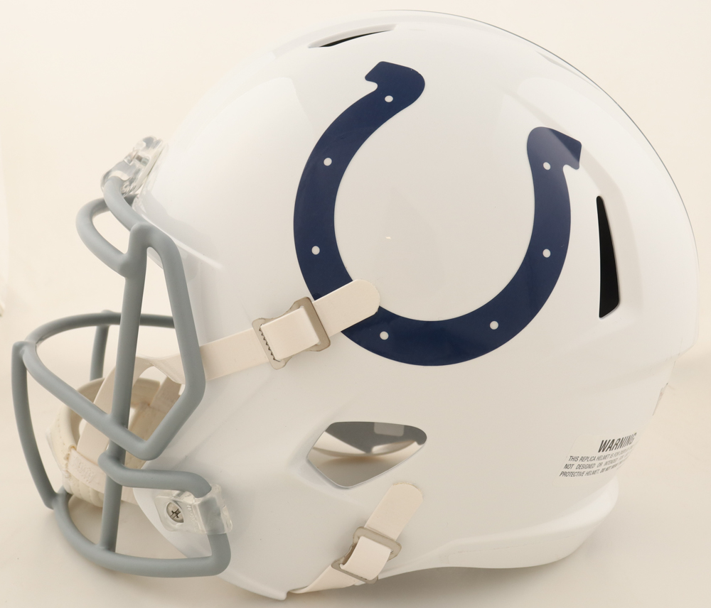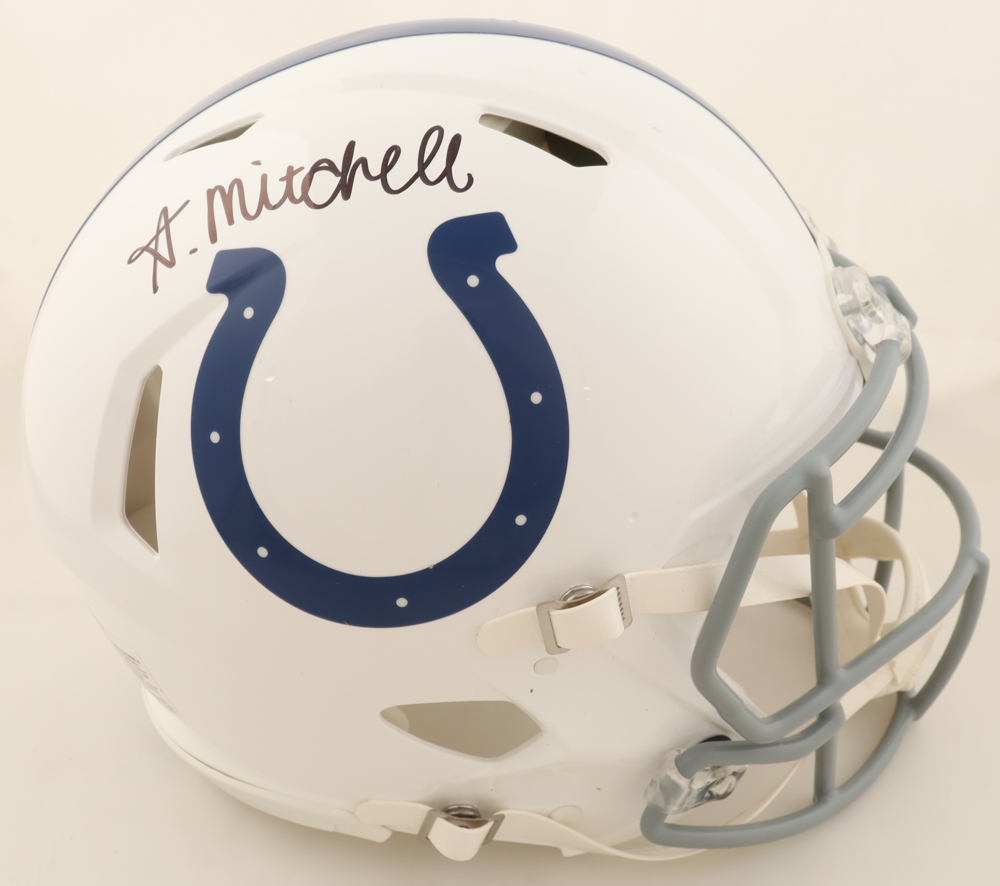 Riddell Indianapolis Colts full-size authentic on-field speed helmet. Hand-signed by Adonai Mitchell.