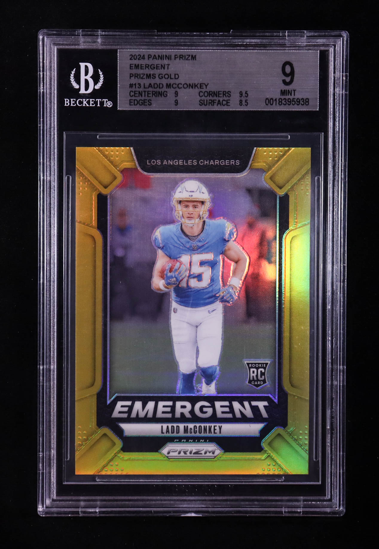 Ladd McConkey 2024 Panini Prizm Emergent Prizms Gold #13 RC #09/10 (BGS 9)