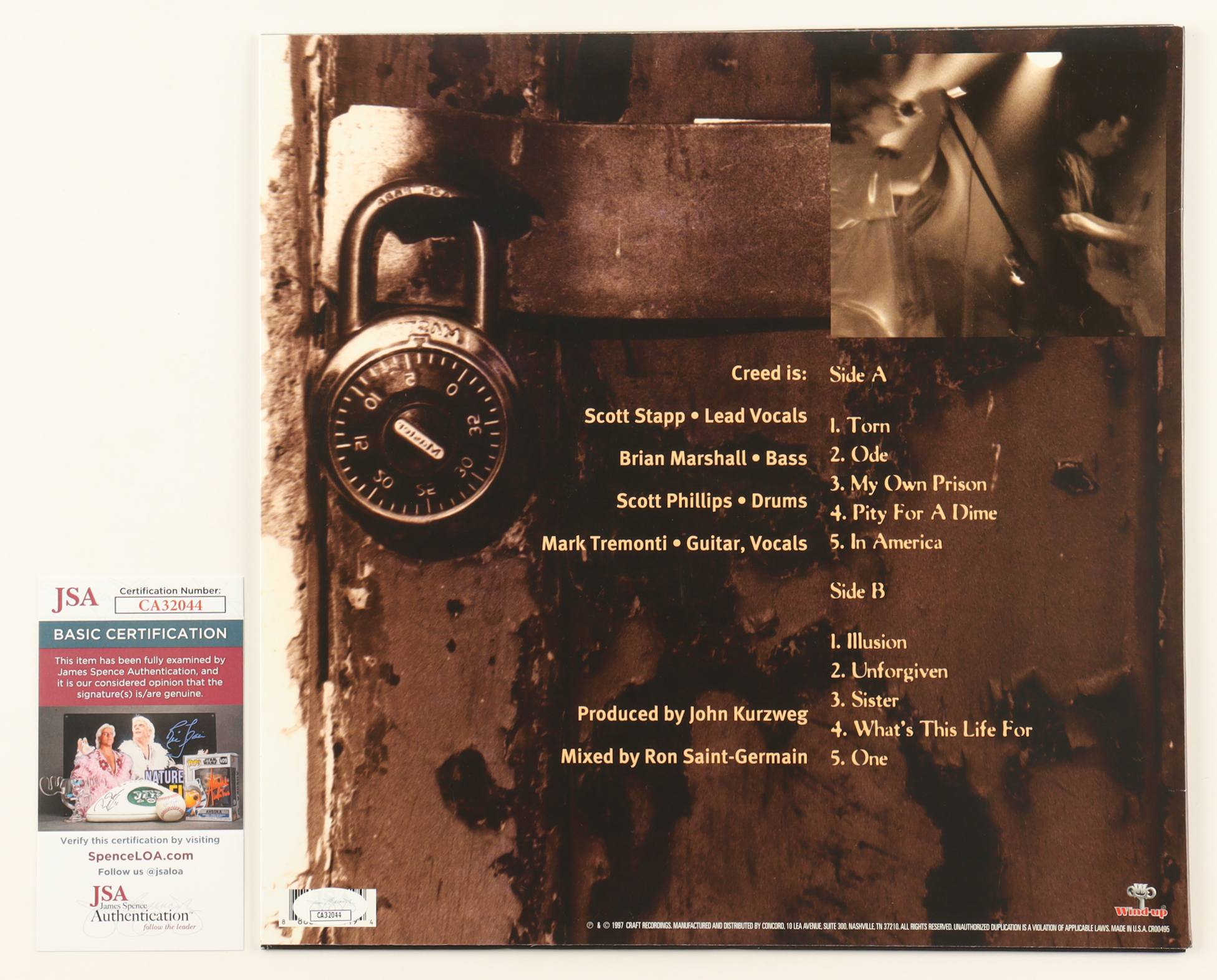 "My Own Prison" Vinyl Record Album has been hand-signed by Scott Stapp, Mark Tremonti, Brian Marshall, and Scott Phillips. Please note, the vinyl record is included and one of the signatures has been smudged. Please see photos for details regarding the condition of the cover.