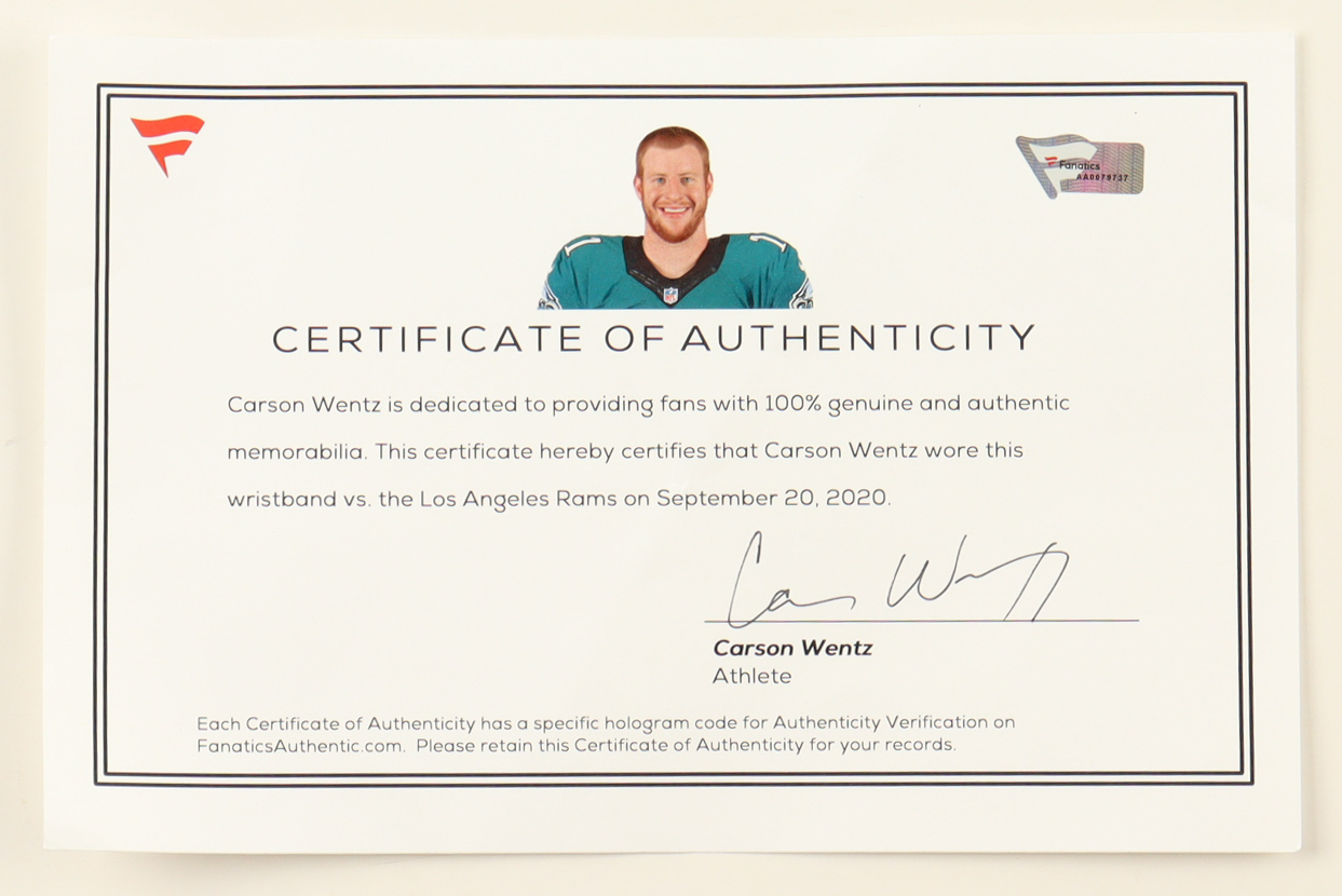 Wristband has been game-used by Carson Wentz (Philadelphia Eagles) against the Los Angeles Rams on September 20th, 2020.