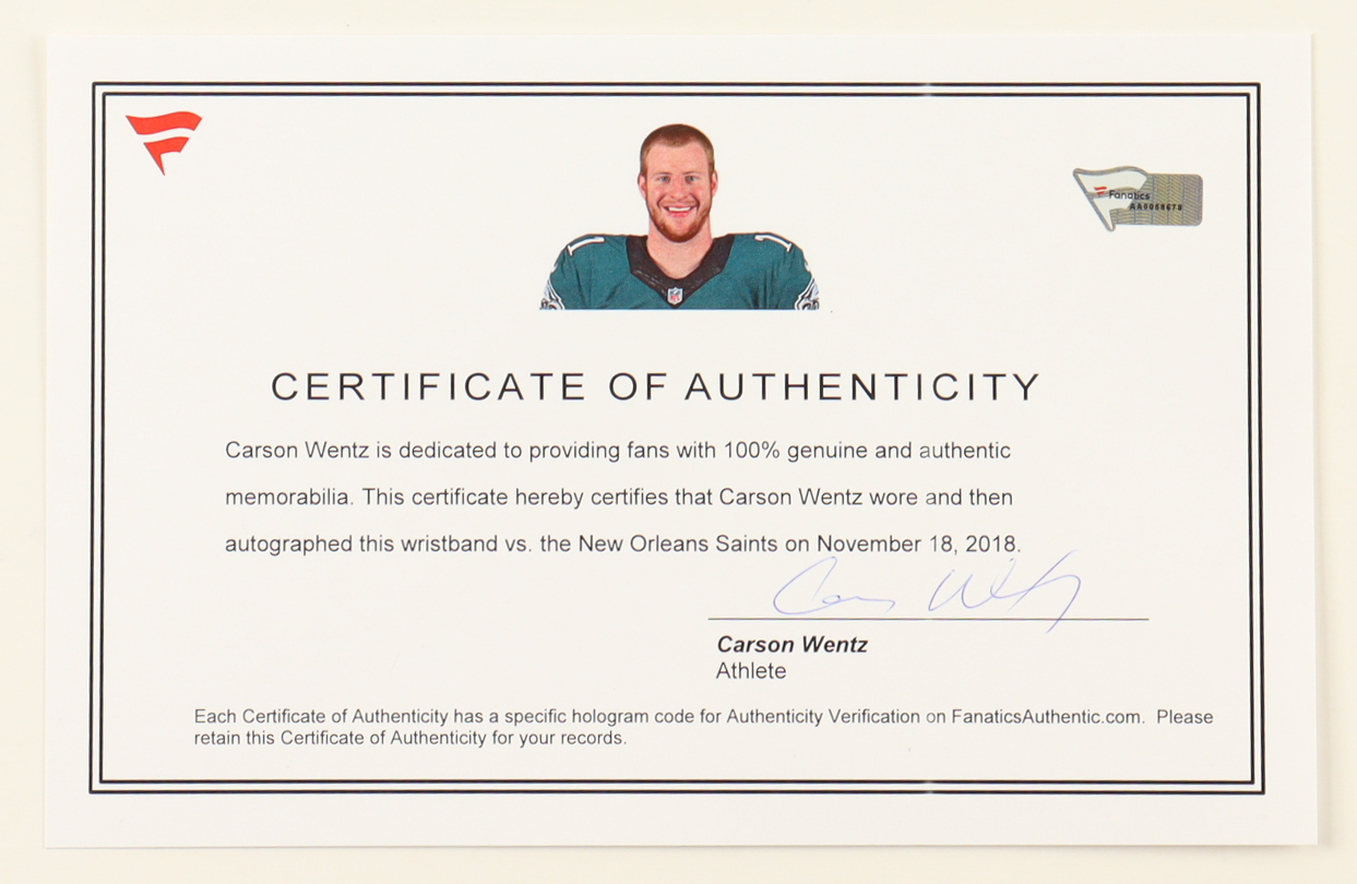 Wristband has been hand-signed and game-used by Carson Wentz (Philadelphia Eagles) against the New Orleans Saints on November 18th, 2018.