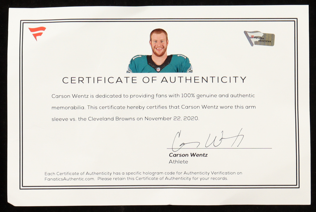 Sleeve has been game-used by Carson Wentz (Philadelphia Eagles) against the Cleveland Browns on November 22nd, 2020.
