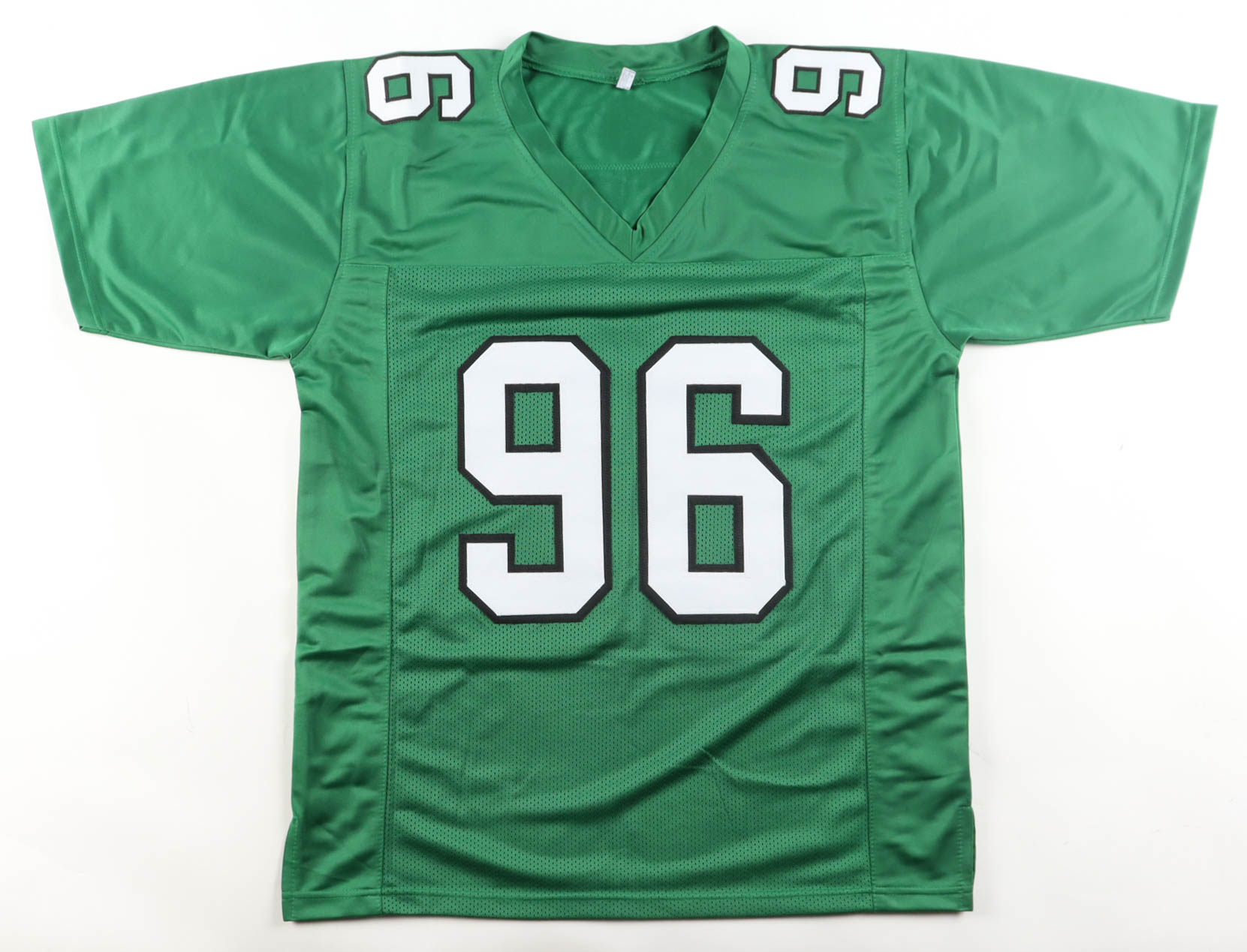 Custom jersey with everything sewn on, size XL. Hand-signed and inscribed by Clyde Simmons.