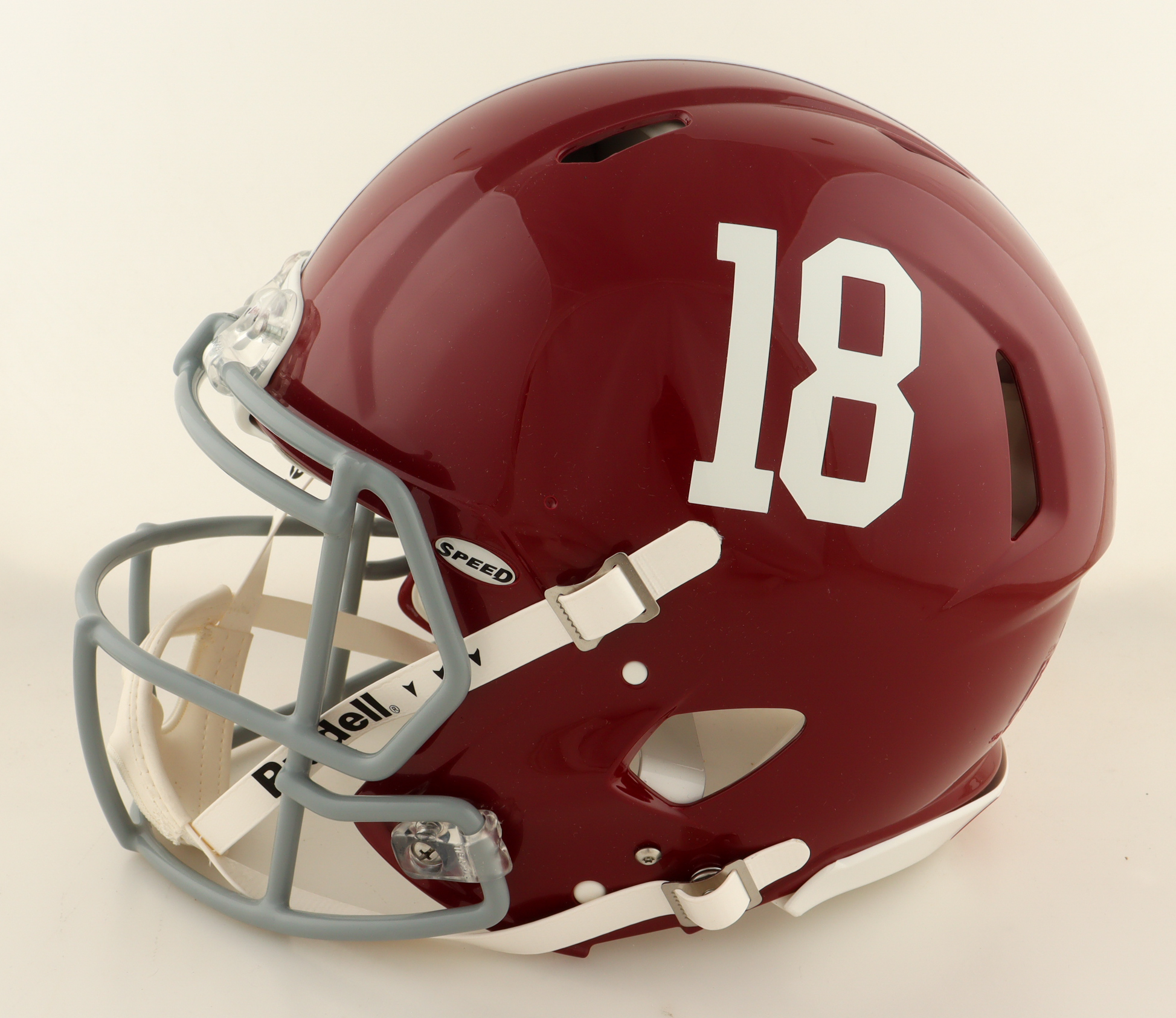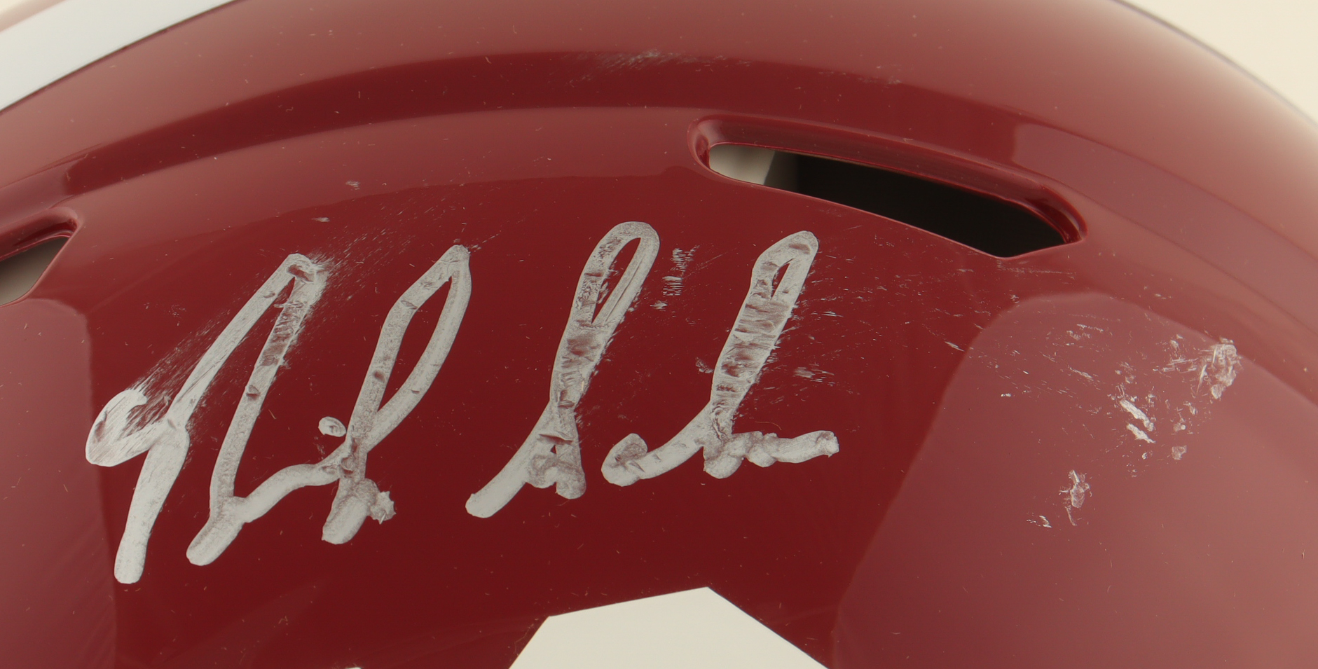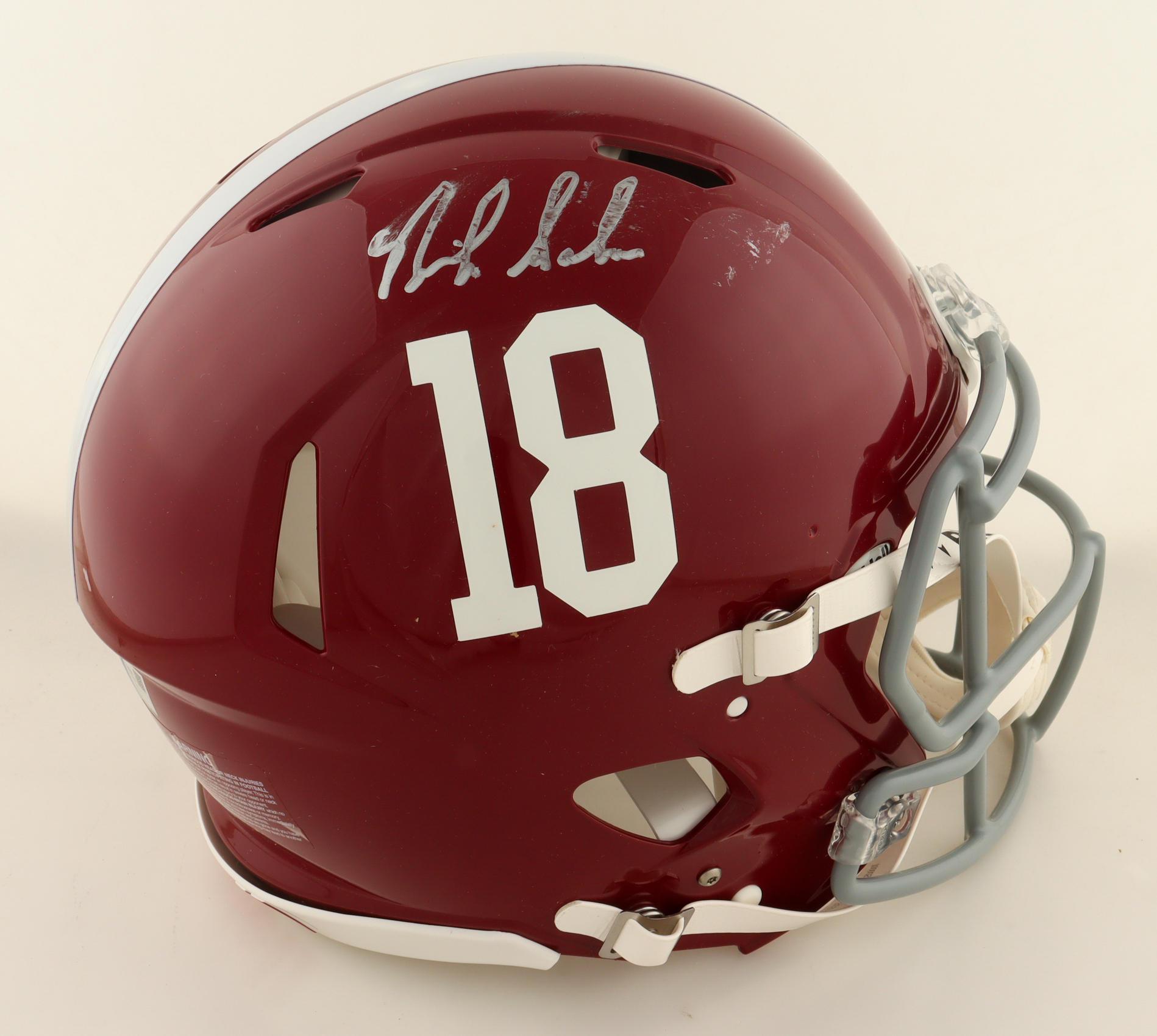Riddell Alabama Crimson Tide full-size authentic on-field speed helmet. Hand-signed by Nick Saban. Please note that the signature is smeared.
