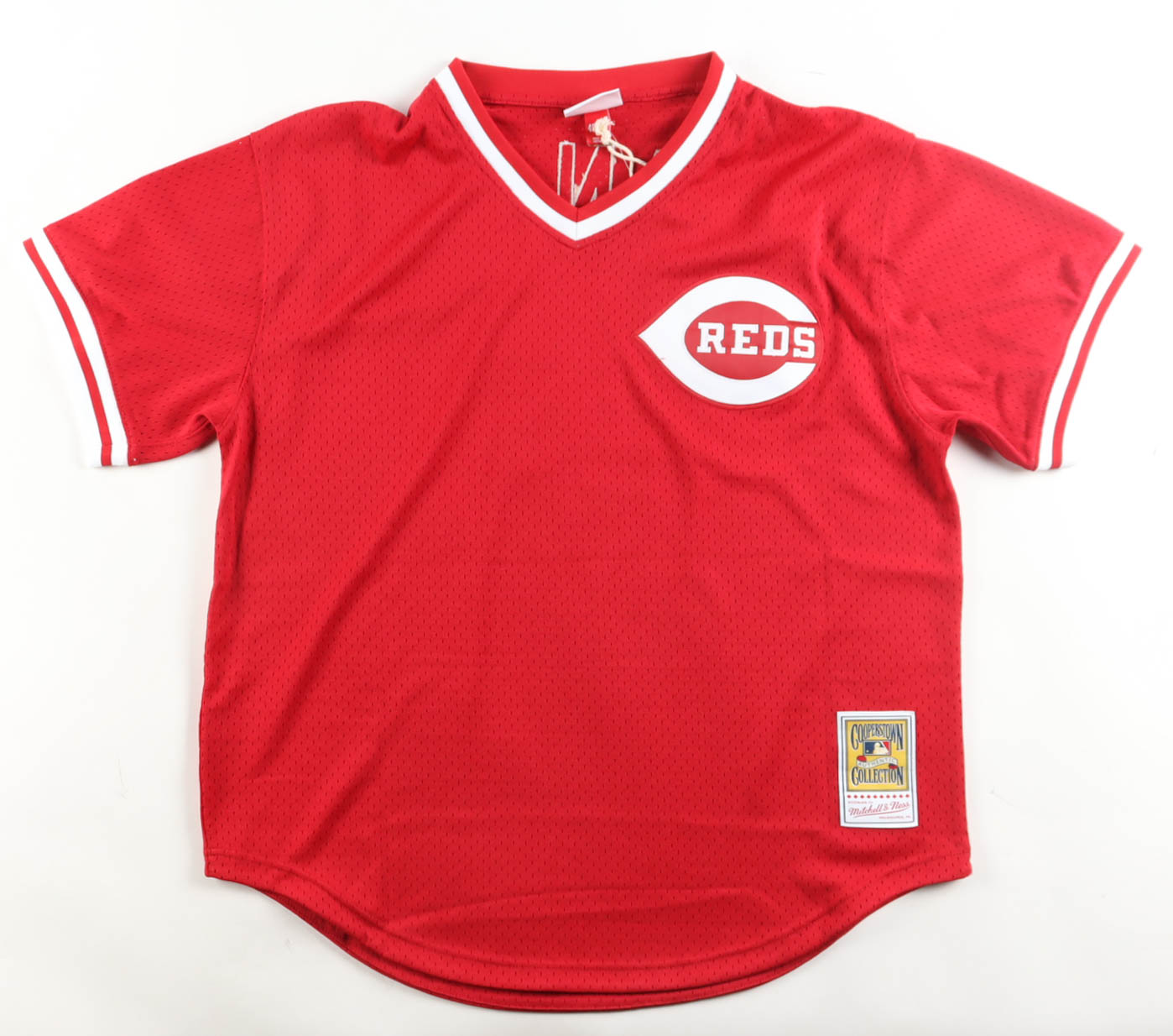 Mitchell & Ness Cooperstown Collection jersey with everything sewn on, size 48 (XL). Hand-signed and inscribed by Johnny Bench (Cincinnati Reds, HOF).