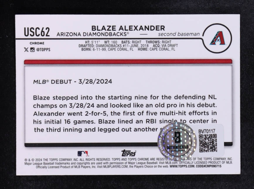 Card has been hand-signed by Blaze Alexander (Arizona Diamondbacks). Please see photos for more details regarding the condition of the card.