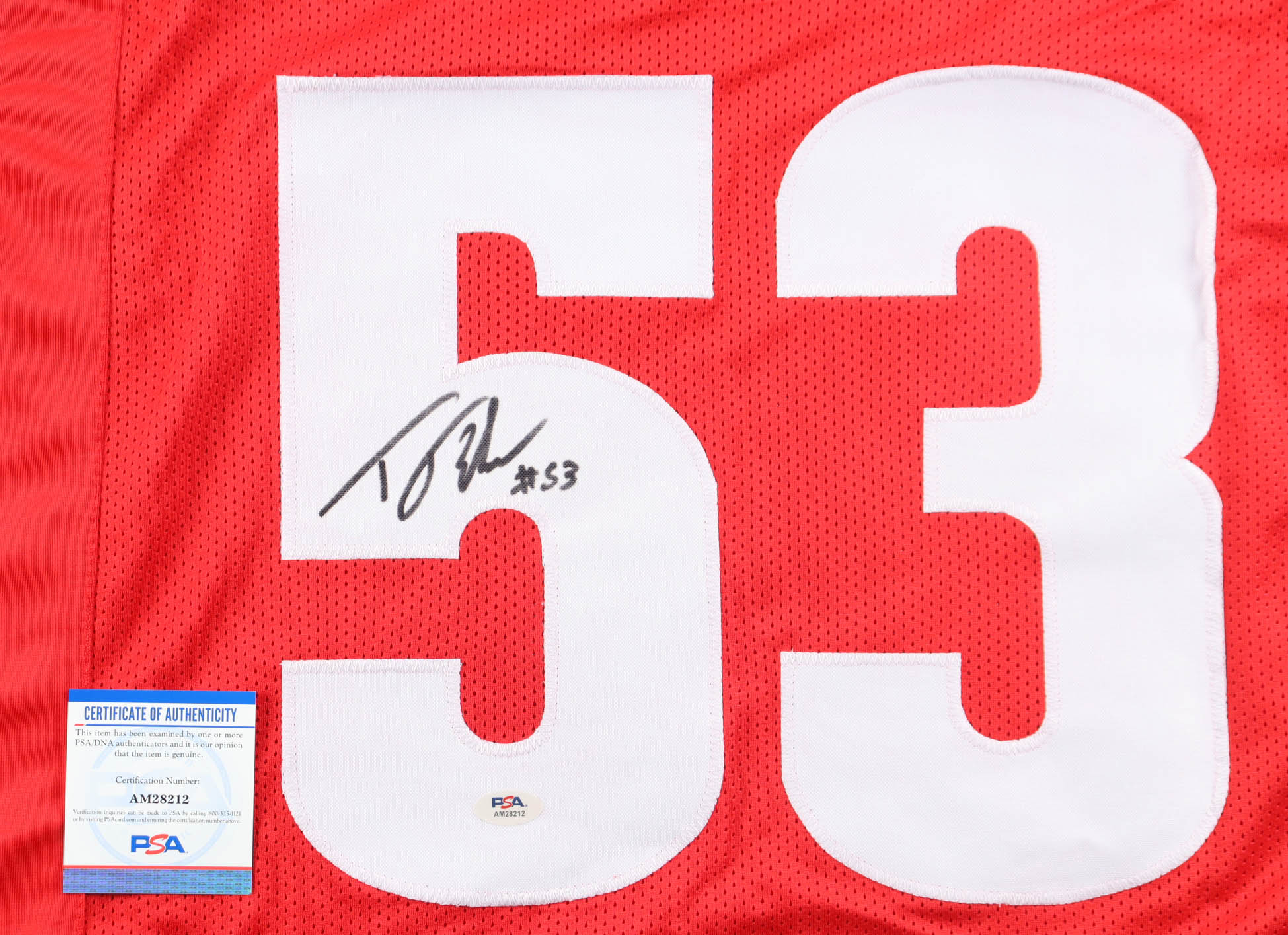 Custom jersey with everything sewn on, size XL. Hand-signed by T. J. Edwards. Please note, glue is visible through the reverse number.
