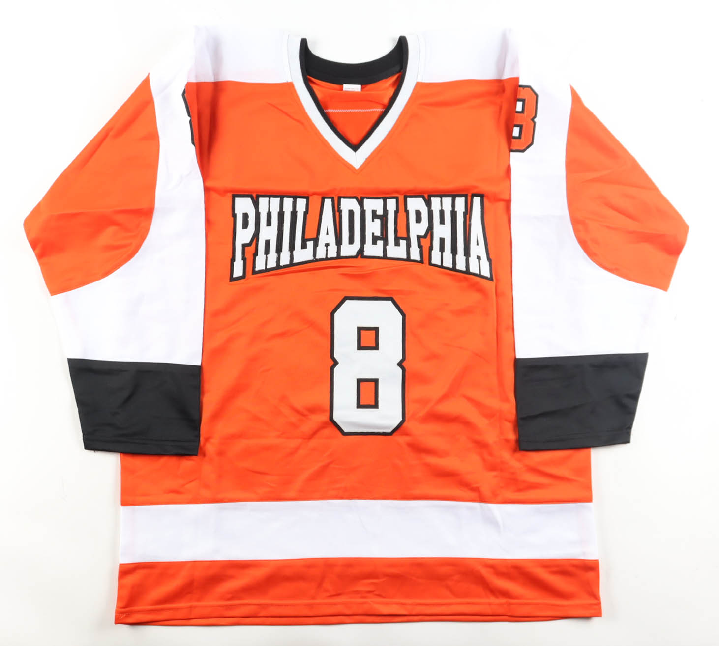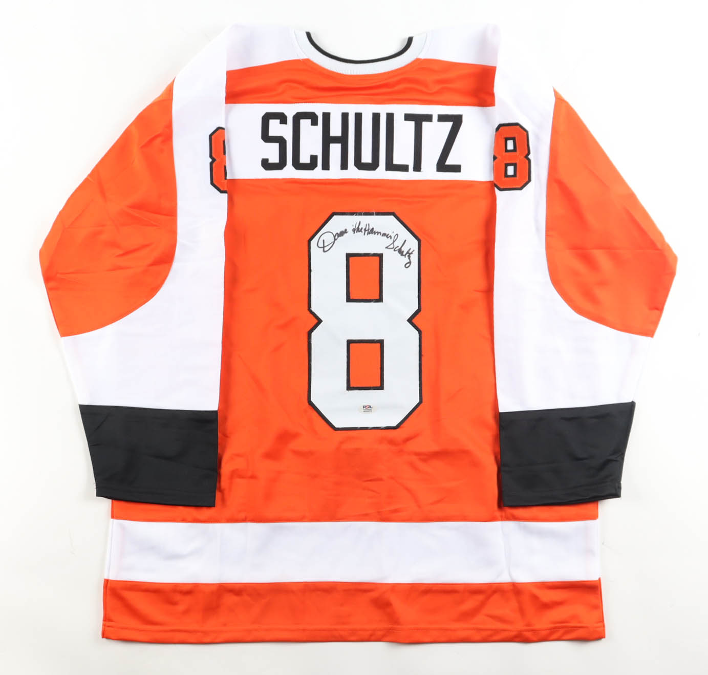Custom jersey with everything sewn on, size XL. Hand-signed by Dave Schultz (Philadelphia Flyers).