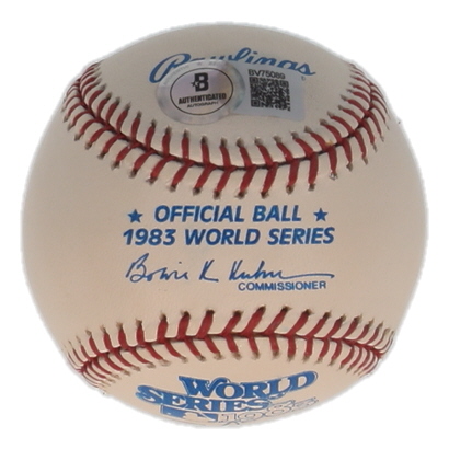 Rawlings Official 1983 World Series Baseball. Hand-signed and inscribed by Rick Dempsey (Baltimore Orioles). Please note, the baseball is naturally toning and stained.