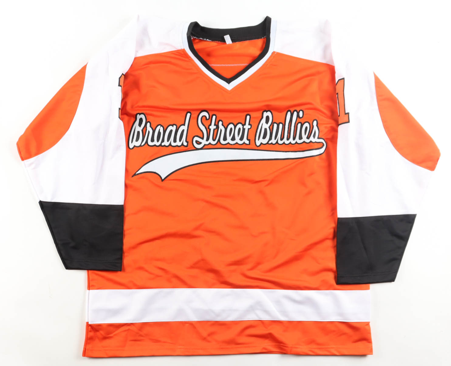 Custom jersey with everything sewn on, size XL. Hand-signed and inscribed by Bernie Parent (D. 2025, Philadelphia Flyers, HOF). Please note, the signature has bled.
