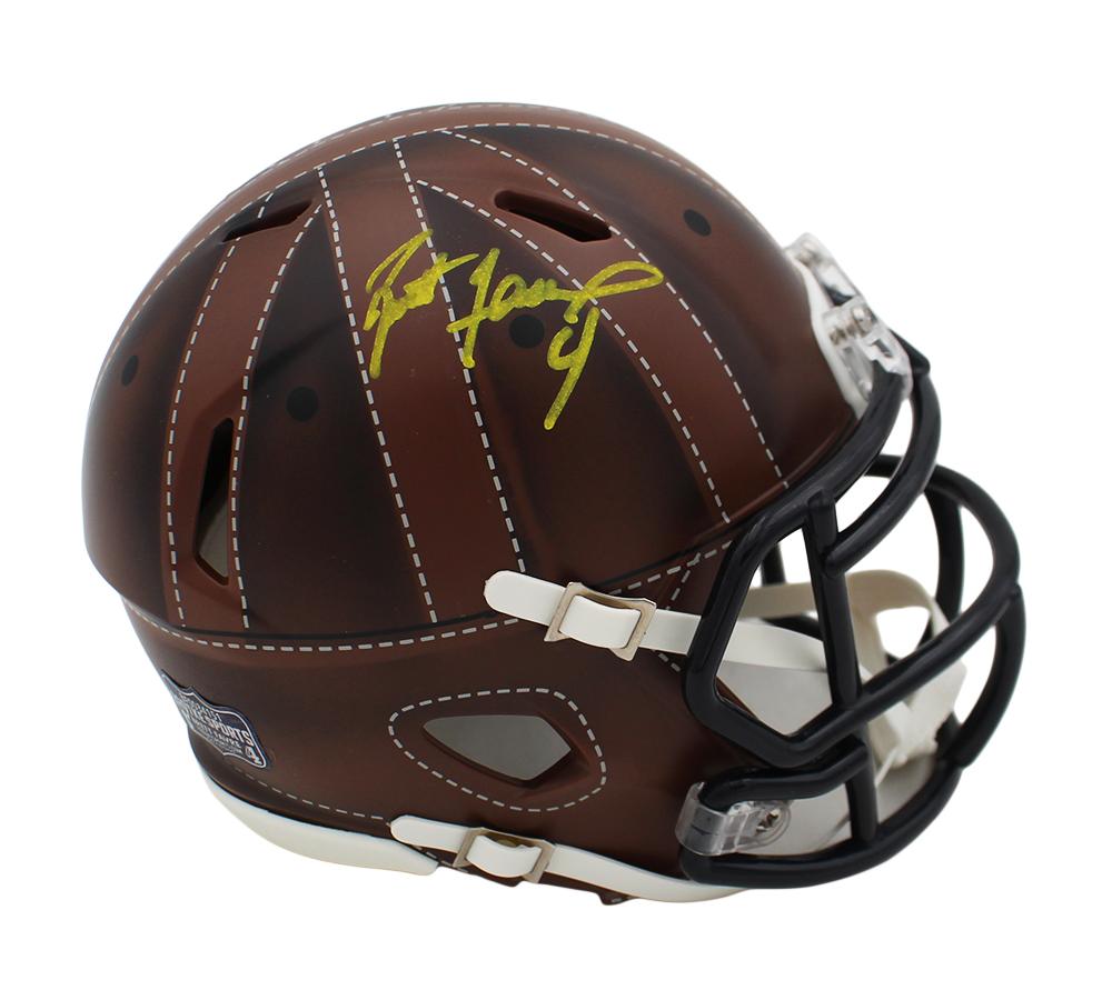 Riddell Green Bay Packers leatherhead alternate speed mini helmet. Hand-signed by Brett Favre (HOF).