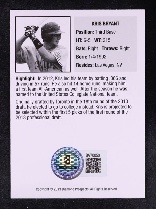 Kris Bryant Signed 2013 Diamond Prospects #NNO RC (Beckett)