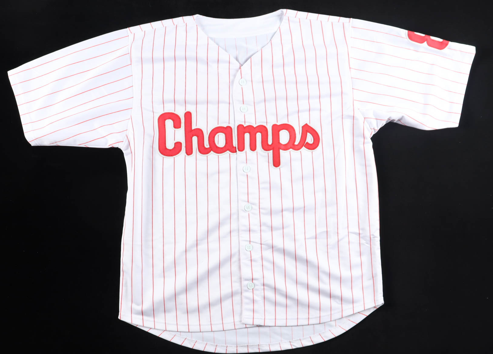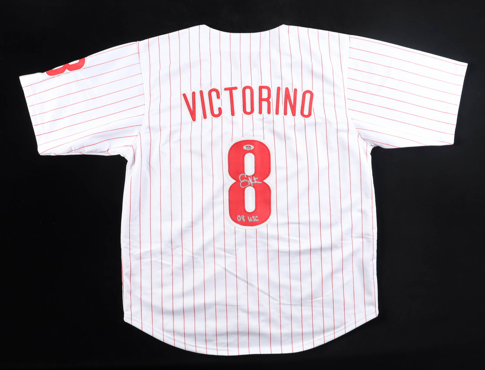 Custom jersey with everything sewn on, size XL. Hand-signed and inscribed by Shane Victorino.