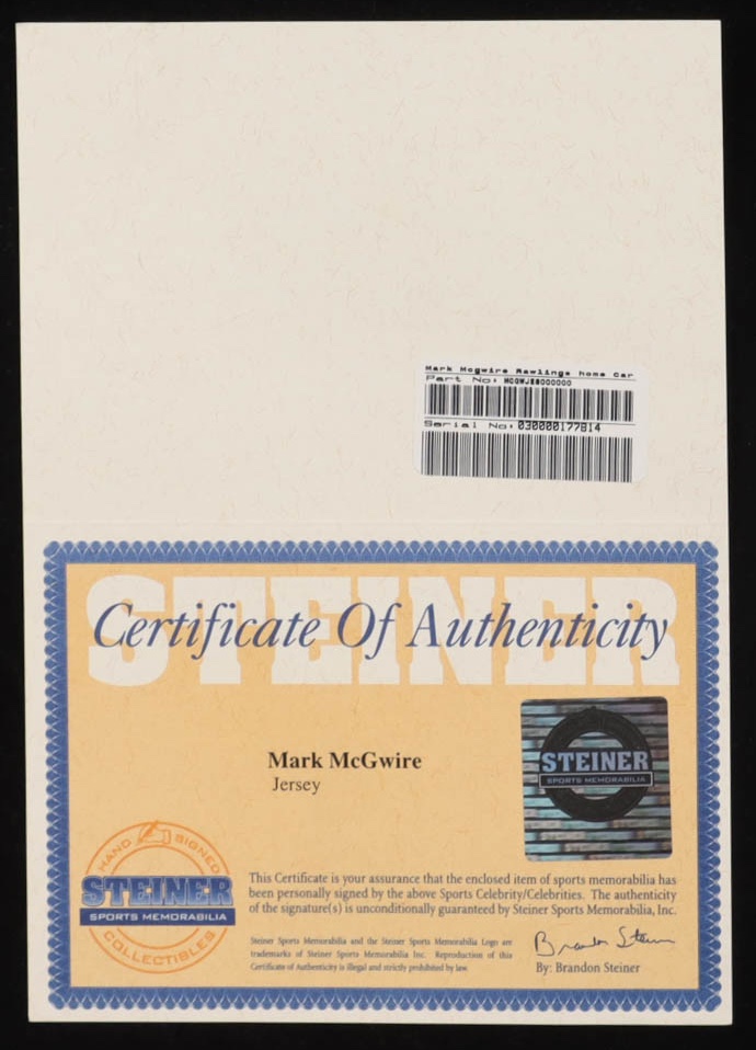 Rawlings authentic jersey with everything sewn on, size 48. Hand signed by Mark McGwire (St. Louis Cardinals). Jersey is hand-written limited edition #21/583.