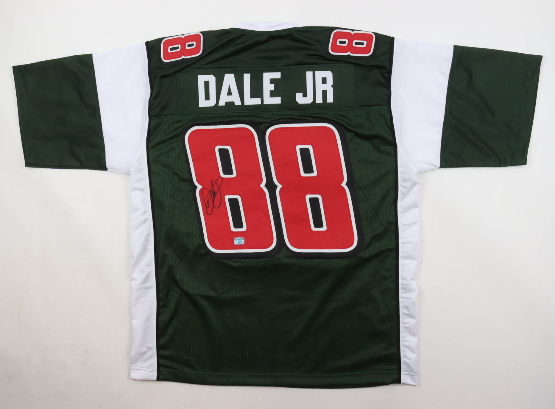 Custom jersey with everything sewn on, size XL. Hand-signed by Dale Earnhardt Jr.