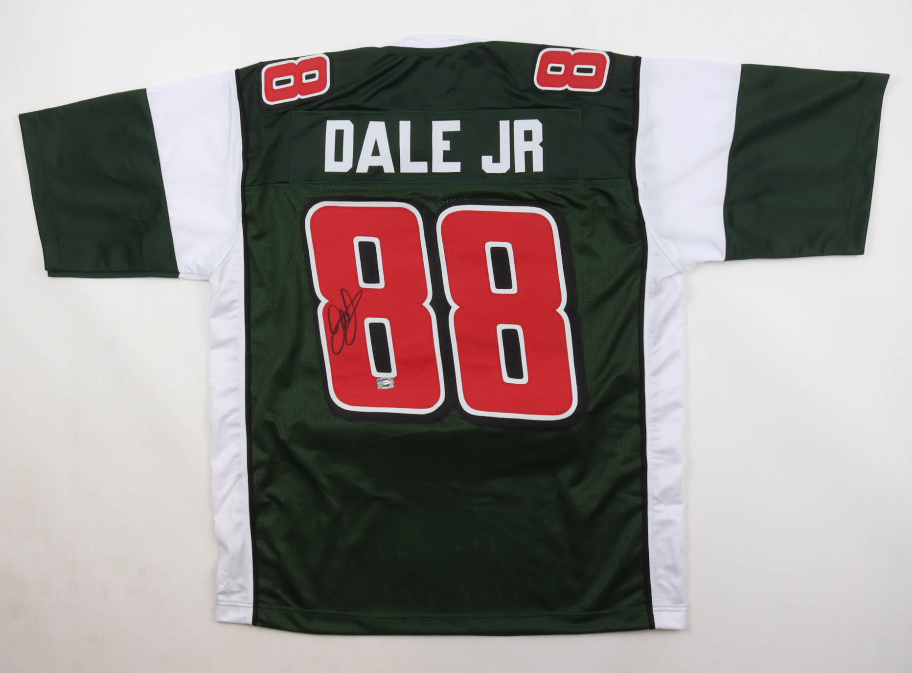 Custom jersey with everything sewn on, size XL. Hand-signed by Dale Earnhardt Jr.