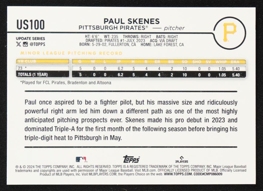 Paul Skenes 2024 Topps Update #US100 RC
