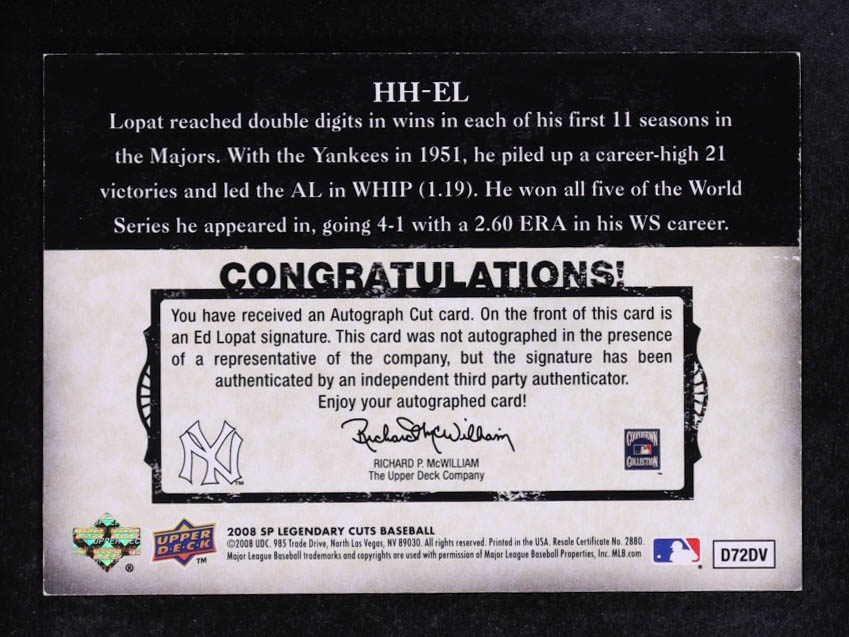 Ed Lopat 2008 SP Legendary Cuts Headliners and Heroes Cut Signatures #EL #13/46